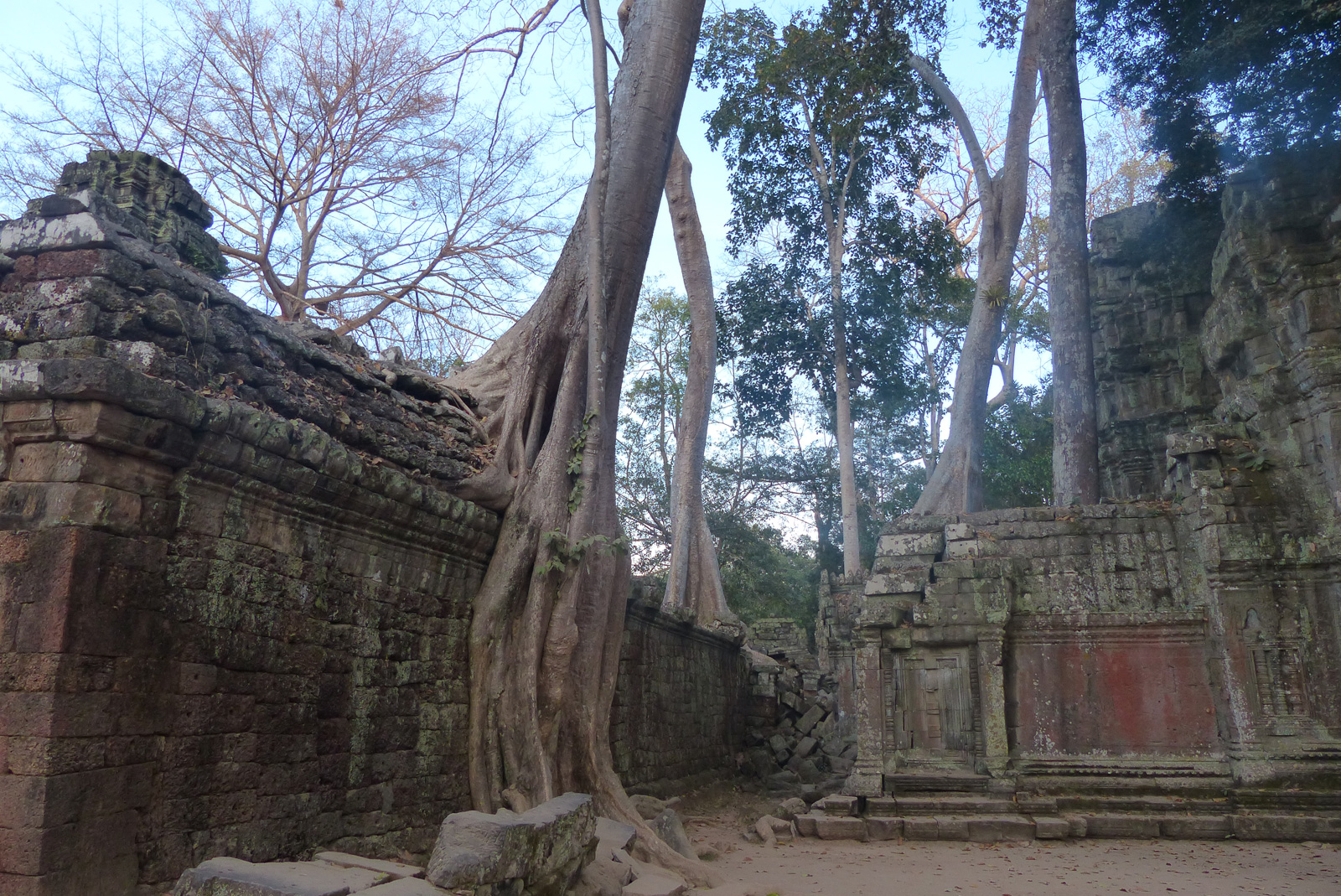Nous arrivons à la fermeture du Ta Phrom, un tout petit peu avant 17h30. En pleurant un peu auprès du garde, accompagné de deux sourires et il nous laisse quand même entrer pour 10 minutes. Ça c’est mal nous connaitre ! Nous y restons une heure. Nous profitons du temple quasiment vide. Ici on se sent l’âme d’un aventurier. Nous sommes au cœur de la jungle, et soudain un mur de pierre transparait entre les arbres. Nous avançons, fendant les broussailles à coup de machette (dans nos rêves, mais bon…) et nous pénétrons dans l’enclos aux coursives fermées par les éboulis. Le challenge est aussi d’éviter le garde qui essaie de nous mettre dehors. C’est un peu ça Ta Prohm et nous, nous avons adoré.