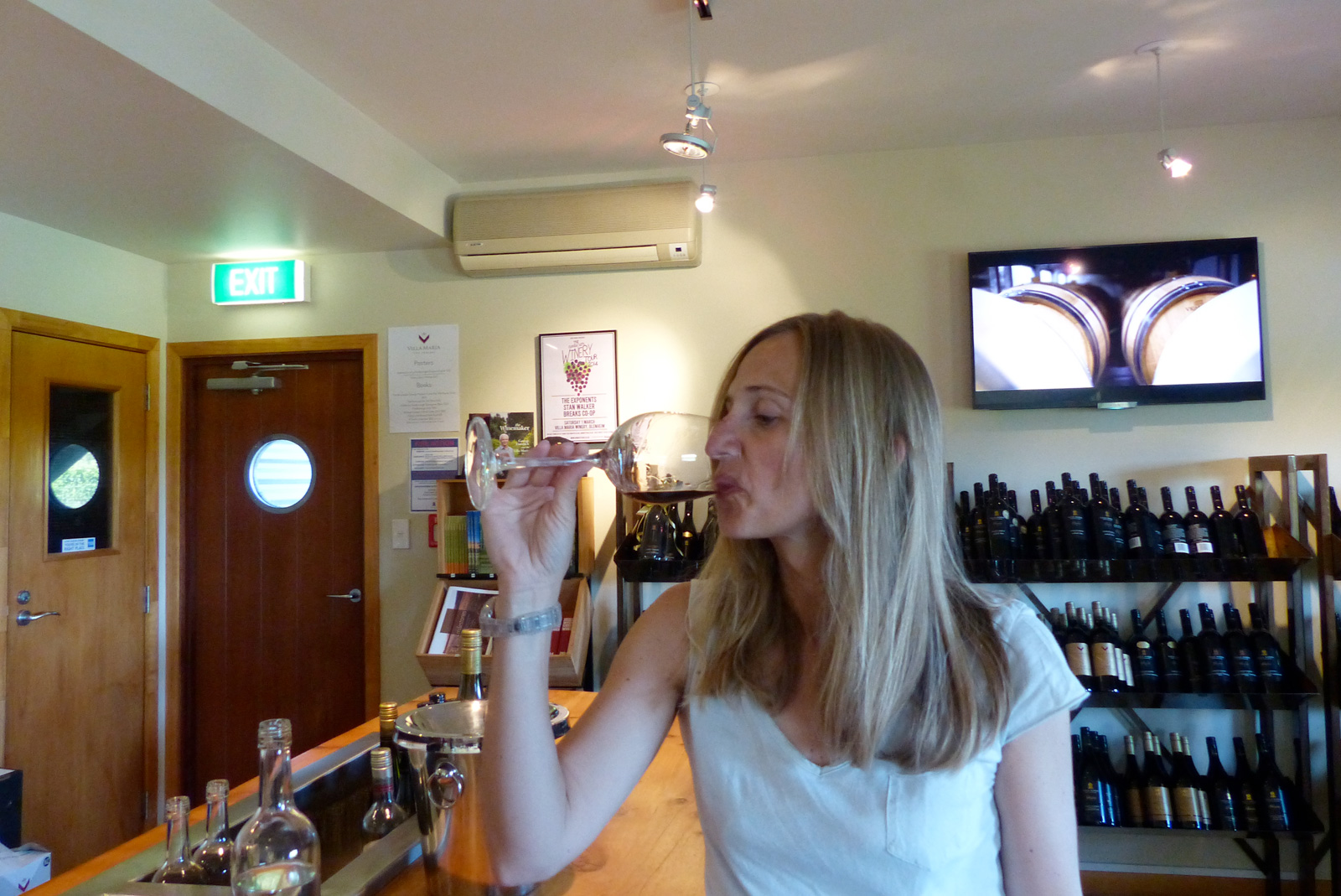 La personne qui s’occupe de la dégustation est très sympa et prend le temps de nous expliquer ses différents vins. Il s’avère que c’est une propriété détenue par une famille qui possède d’autres exploitations en Nouvelle Zélande (sur l’ile du Sud et l’ile du Nord), ce qui leur permet de proposer différents cépages. En effet la région de Blenheim est réputée pour le sauvignon blanc et le pinot gris (ça tombe mal, Vyrg n’aime pas le vin blanc sec !), le cabernet sauvignon par contre est produit dans l’ile du Nord. Cette propriété est connue et exporte une partie de ses récoltes à l’étranger (en Australie et en Angleterre notamment). Compte tenu de l’expérience de la veille, on lui précise que l’on ne veut surtout pas de vin acide et qu’on a déjà testé un pinot noir sans succès. Elle insiste quand même pour nous faire goûter mais le verdict est le même qu’hier : trop acide! On testera ensuite un shiraz qui a une plus belle robe et un peu plus de corps. Ce n’est pas tout à fait ça, ça manque toujours de maturité mais c’est mieux. Ensuite elle nous fait tester un merlot organic (le bio c’est beau mais pas toujours bon !).