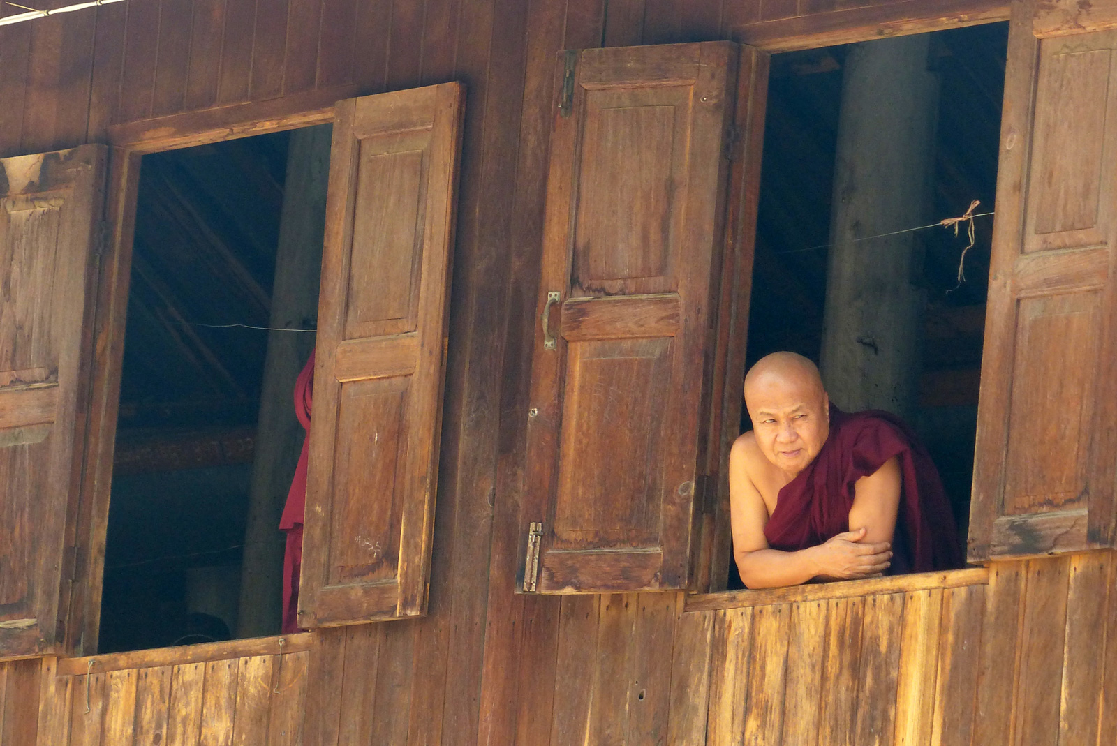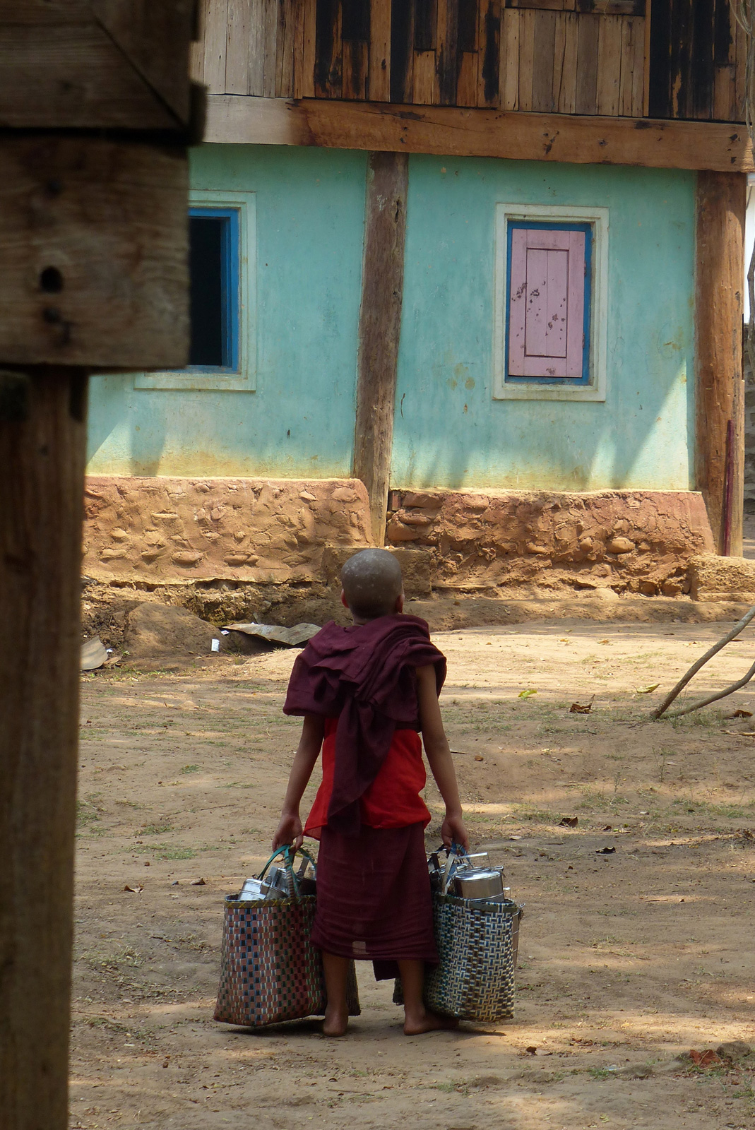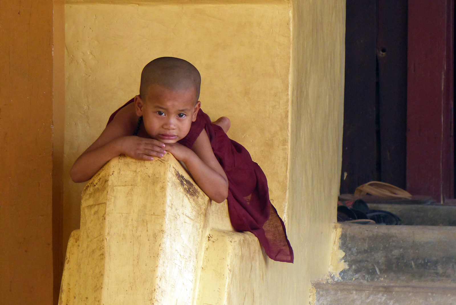 Nous arrivons à Hsipaw, toujours au Myanmar, par le bus de nuit en provenance du lac Inle. Nous prenons un bon petit déjeuner et partons à vélo pour le mini Bagan. Pas certaines d’être arrivées au bon endroit, nous nous arrêtons à un monastère pour demander conseil. Les petits bonzes sont tout excités de nous voir.