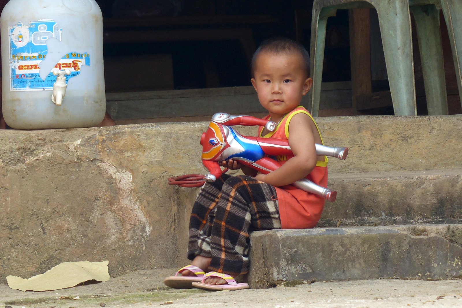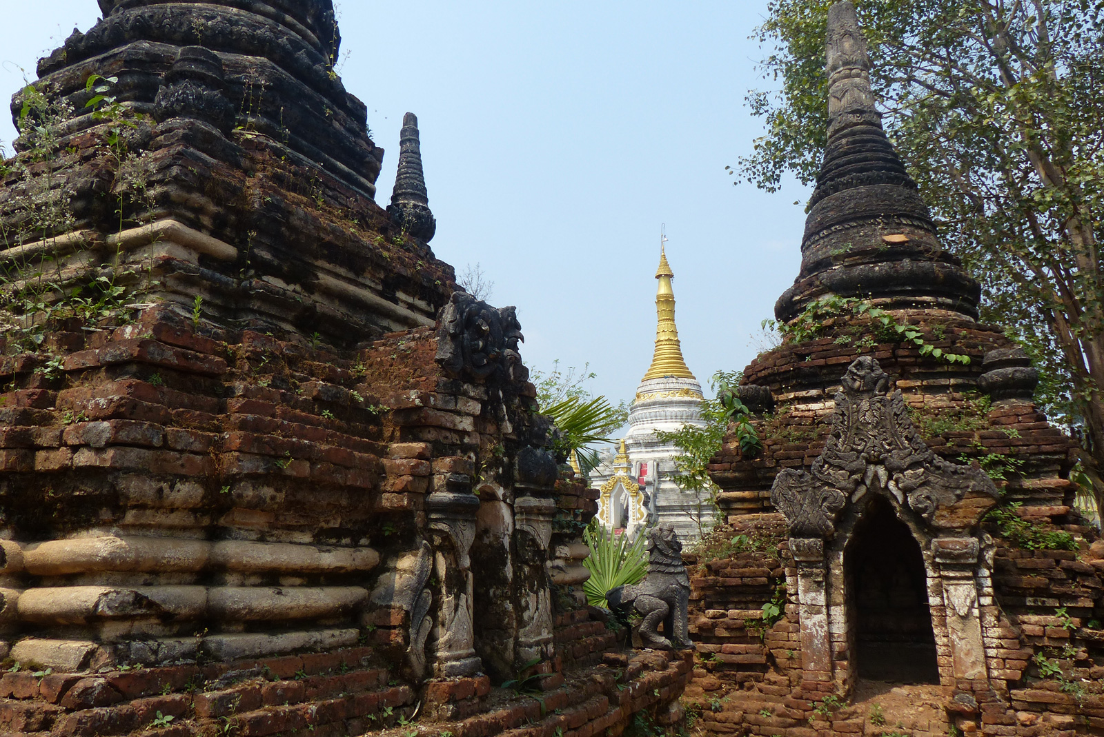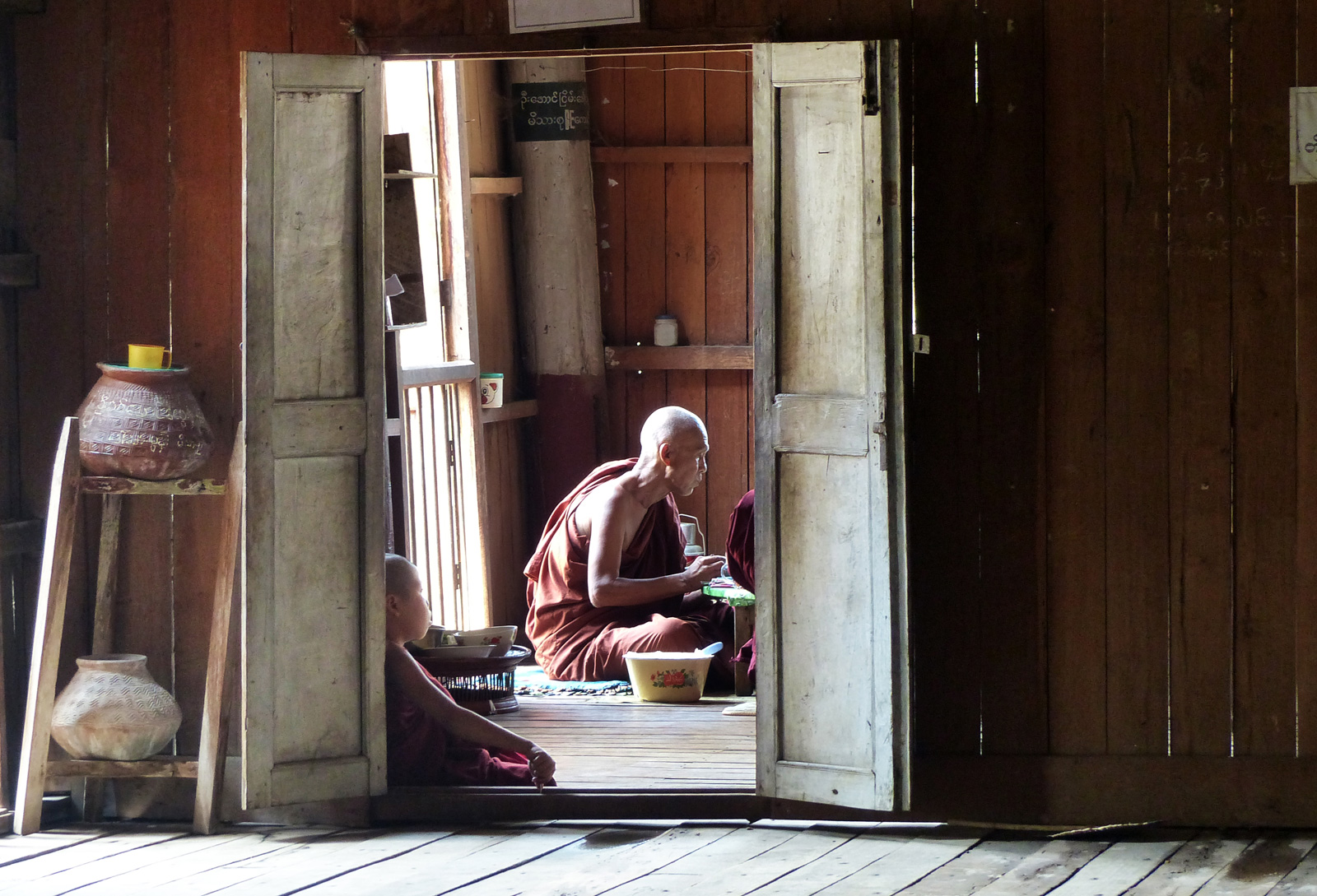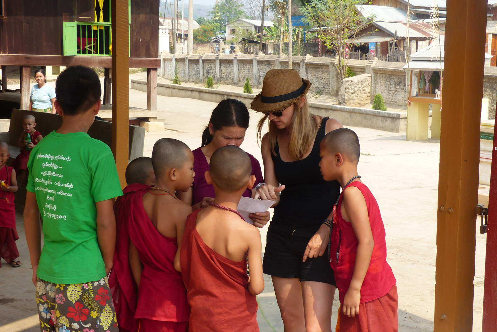 Nous arrivons à Hsipaw, toujours au Myanmar, par le bus de nuit en provenance du lac Inle. Nous prenons un bon petit déjeuner et partons à vélo pour le mini Bagan. Pas certaines d’être arrivées au bon endroit, nous nous arrêtons à un monastère pour demander conseil. Les petits bonzes sont tout excités de nous voir.
