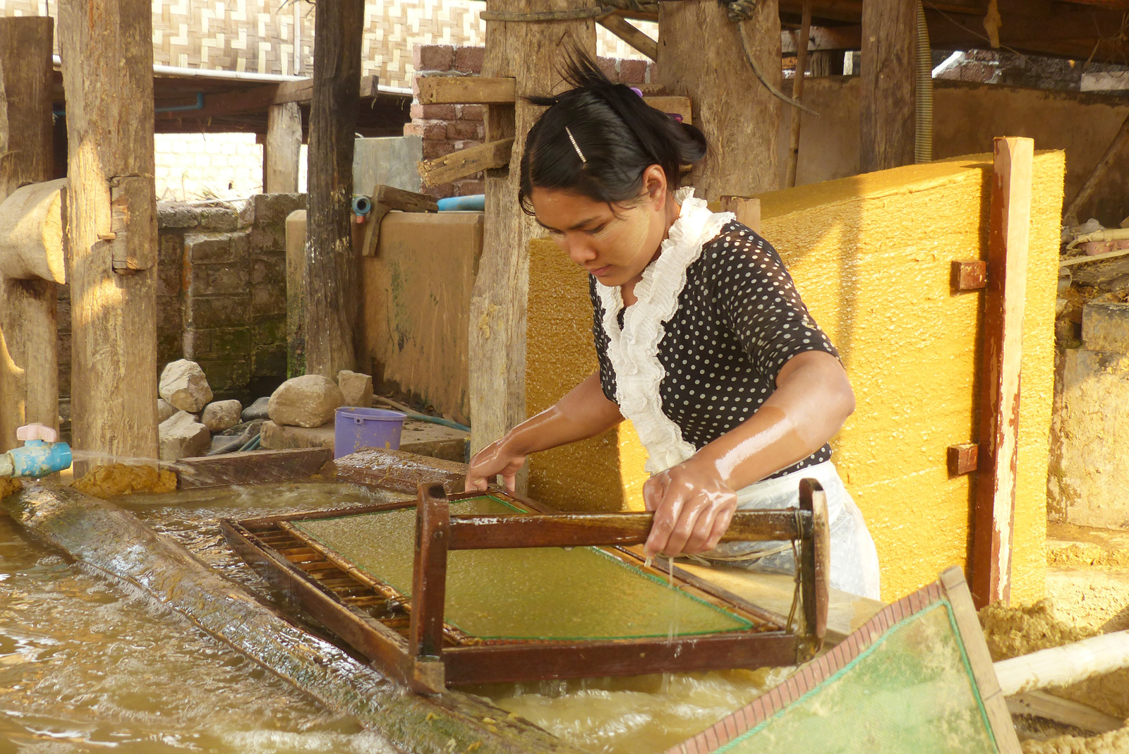 Bien rassasiées, nous nous rendons à une fabrique de papier de bambou à la sortie de la ville. Nous entrons, les gens sont très accueillants et souriants. Ils semblent tout de même se demander qu’est ce qui peut bien nous intéresser… pour eux ce n’est qu’une tâche banale.