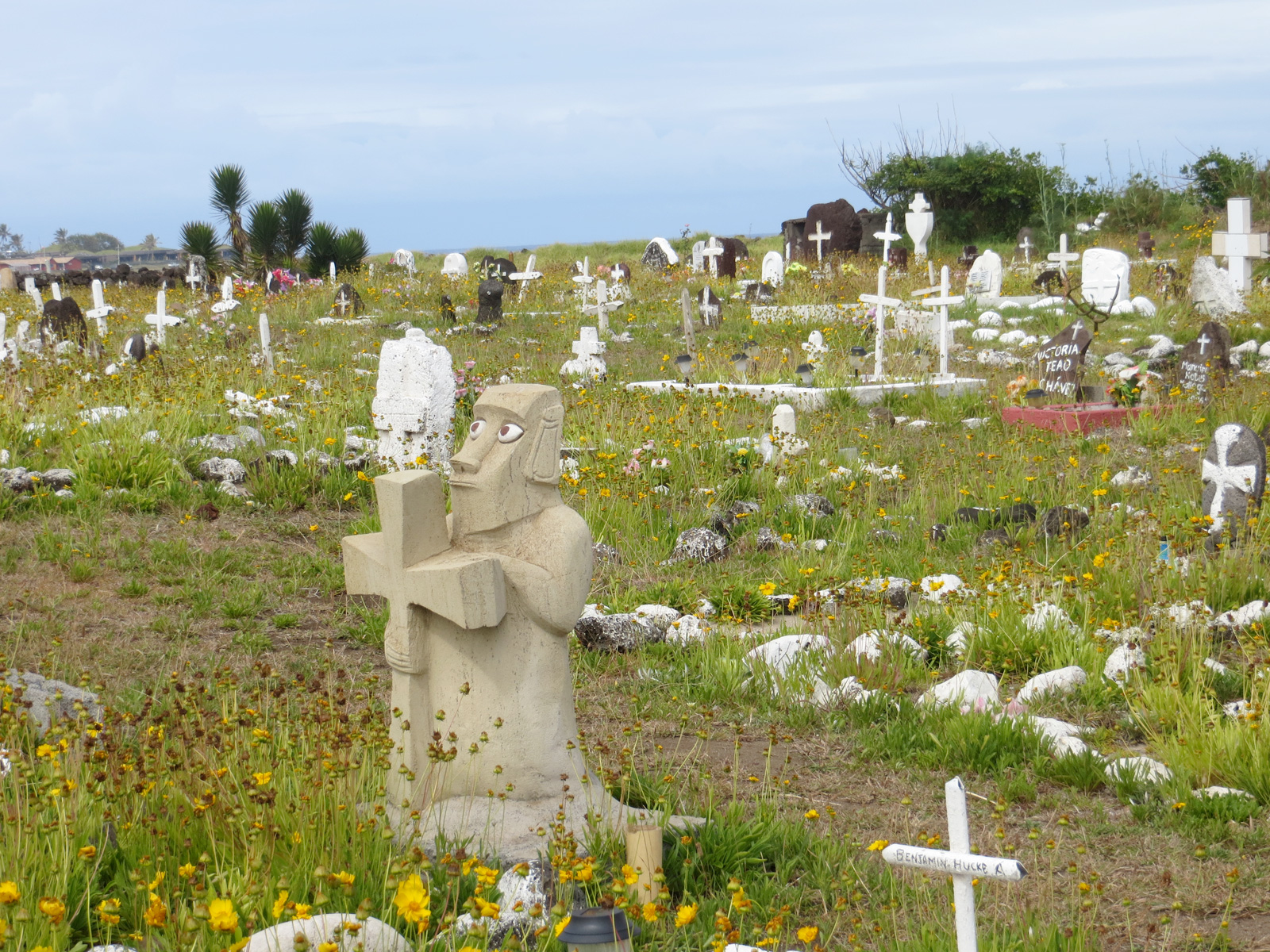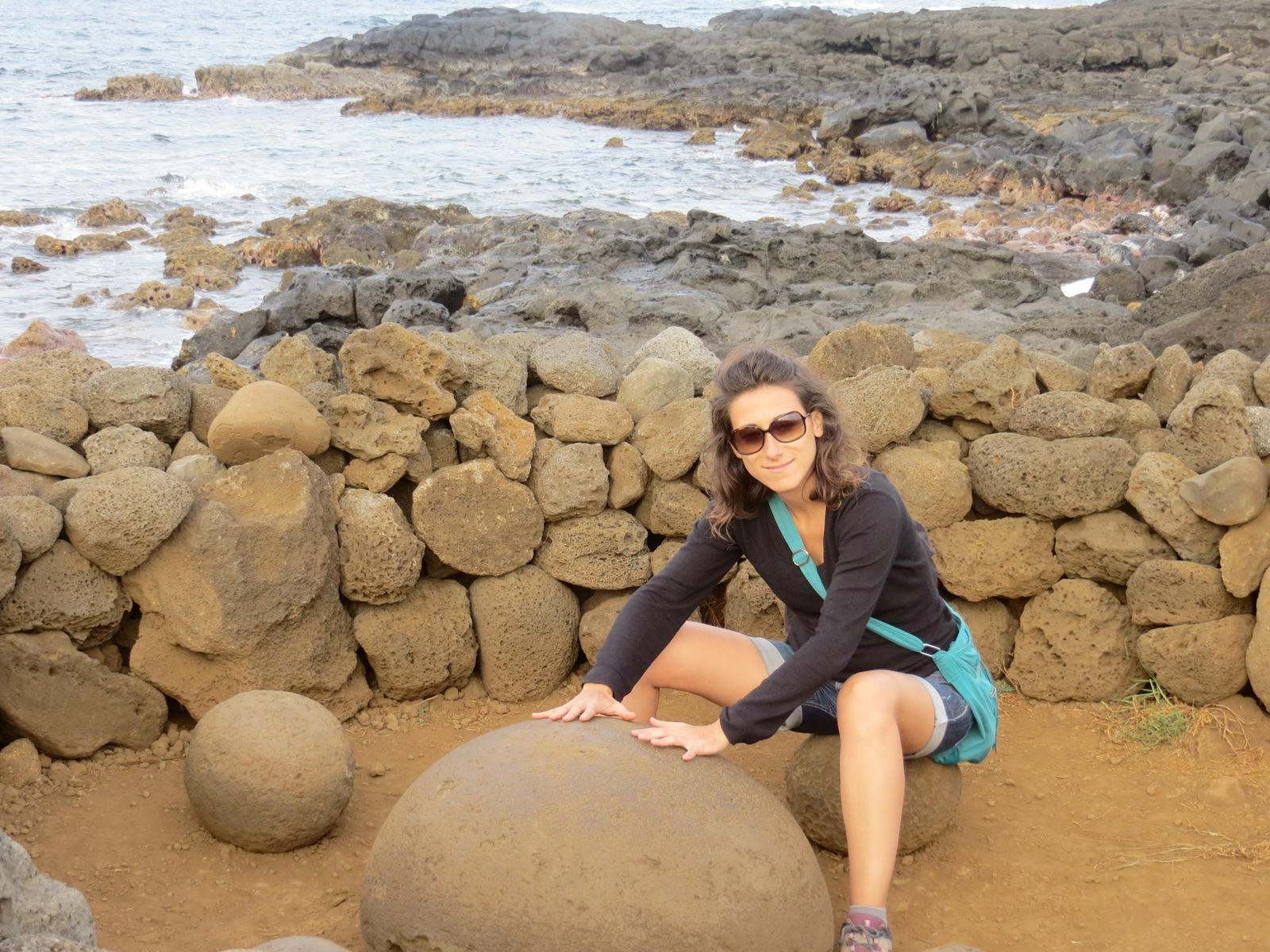 Nous démarrons la journée par une petite balade le long de la côte de Tahai (où nous logeons), jusqu’à Hanga Roa. A peine arrive-t-on au bord de mer que wahou, un moai ! Les moais sont ces grosses statues de pierre, typiques de l’Ile de Pâques. Notre premier Moai ! Nous sommes obligées de le mitrailler de photos. On est paparazzi ou on ne l’est pas ! Après 30 minutes de marche nous avons déjà vu 15 moais. Oui, oui, c’est ça il y en a partout !