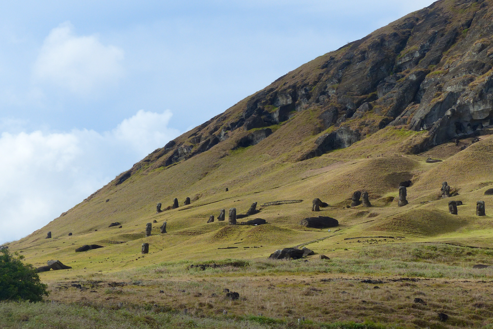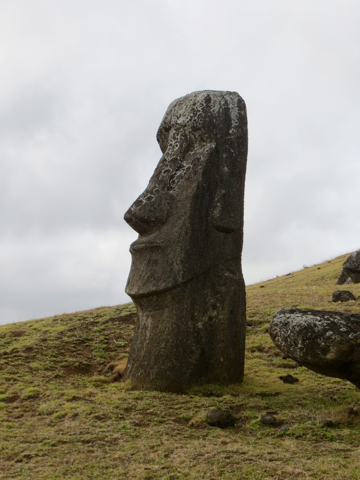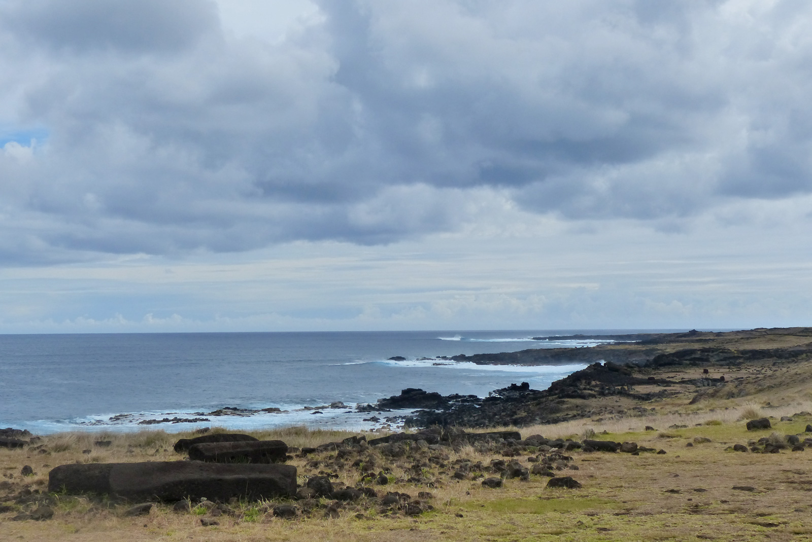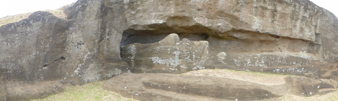 Nous redescendons et empruntons le sentier qui longe le versant du volcan, face à la mer. Ici encore, plusieurs centaines de Moaïs inachevés ou abandonnés en cours de transport. Nous remarquons un Moaï géant dans la paroi, comme allongé. Il s’agit en fait du plus grand Moaï jamais sculpté (21m et 200 tonnes). Il n’a jamais été finit mais n’aurait probablement jamais pu être transporté.