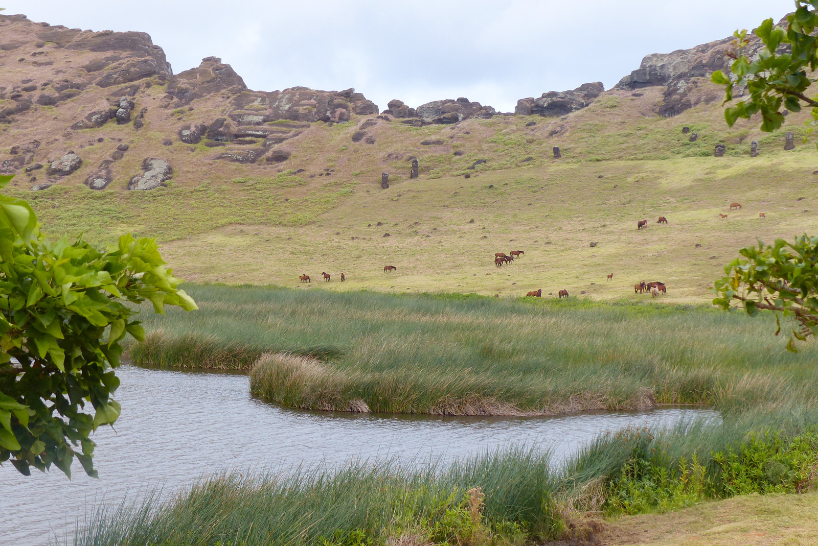 L’entrée au parc est de 60000 pesos pour 4 jours. Comme nous venons tard et que nous sommes avec un Rapa Nui, notre hôte arrive à nous faire entrer gratis ;-p Nous commençons par grimper au centre du volcan. Dans le cratère nous découvrons un joli petit lac, frangé de joncs. Des dizaines de chevaux et de poulains sauvages paissent tout autour. Des Moais, sentinelles droites, les surveillent. La lumière du crépuscule colore ce paysages dans des tons rouges et ocres, splendide !