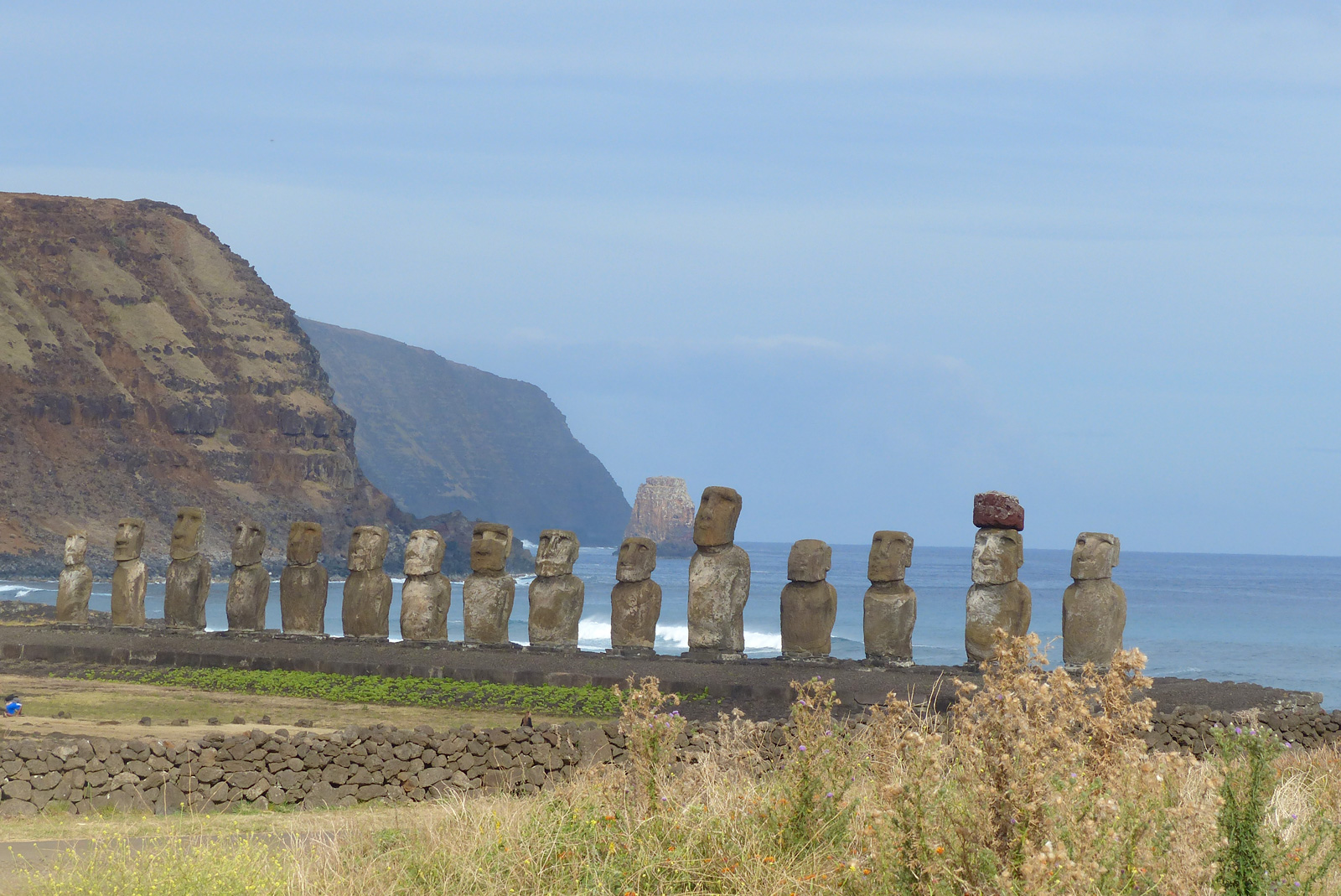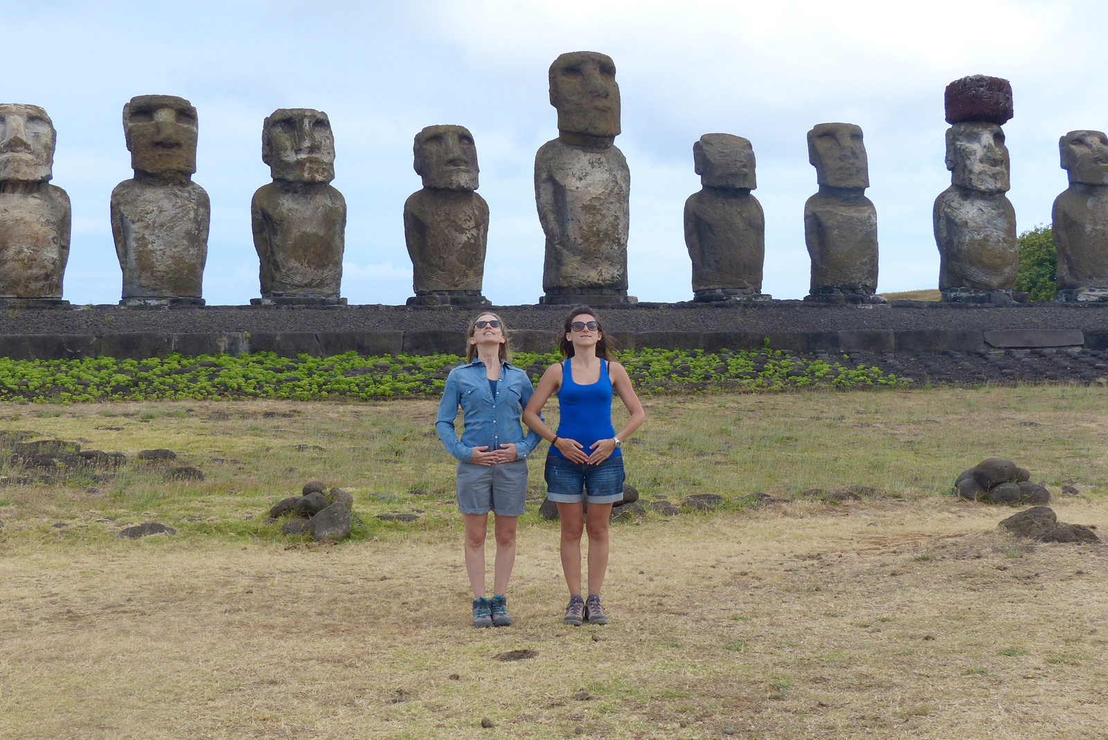 Arrivées devant l’Ahu (le socle qui supporte les statues), nous sommes assez émerveillées. Les 15 Moaïs s’étendent sur 200 mètres. Un seul d’entre eux possède son Pukao, son couvre chef. Nous restons un moment et décidons de revenir sur ce site quelques jours plus tard au lever du soleil.