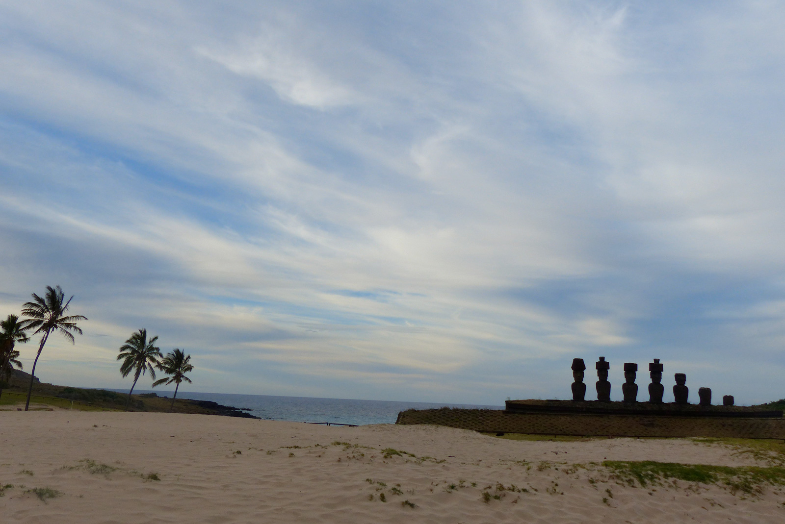 Dernier stop sur la plage de Anakena au Nord de l’île. Nous traversons une belle cocoterai pour pénétrer sur la seule plage de sable fin de l’île (hummm nous y reviendrons pour piquer une tête :-p). Sur la plage, l’ahu Nau Nau et ses 7 statues dominent superbement l’ensemble.