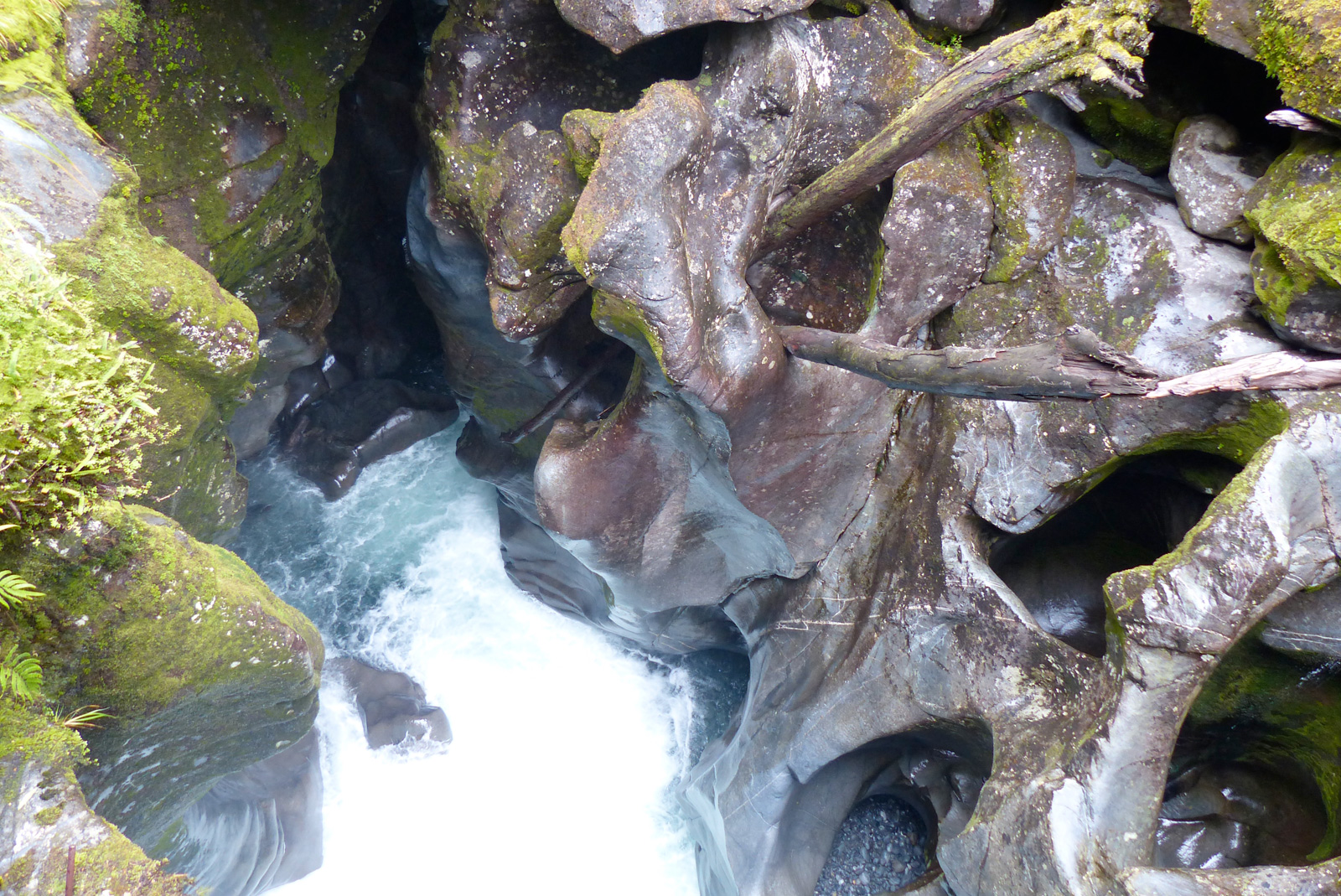 Nous reprenons la route et pensons profiter de tout ce qu’il y a à voir le long de la route et que nous avions repéré le matin. Premier arrêt aux abords d’une forêt luxuriante avec des fougères de la taille d’un arbre, pour nous rendre à une cascade. Les roches ont été polies par l’eau et les pierres qu’elle transporte.