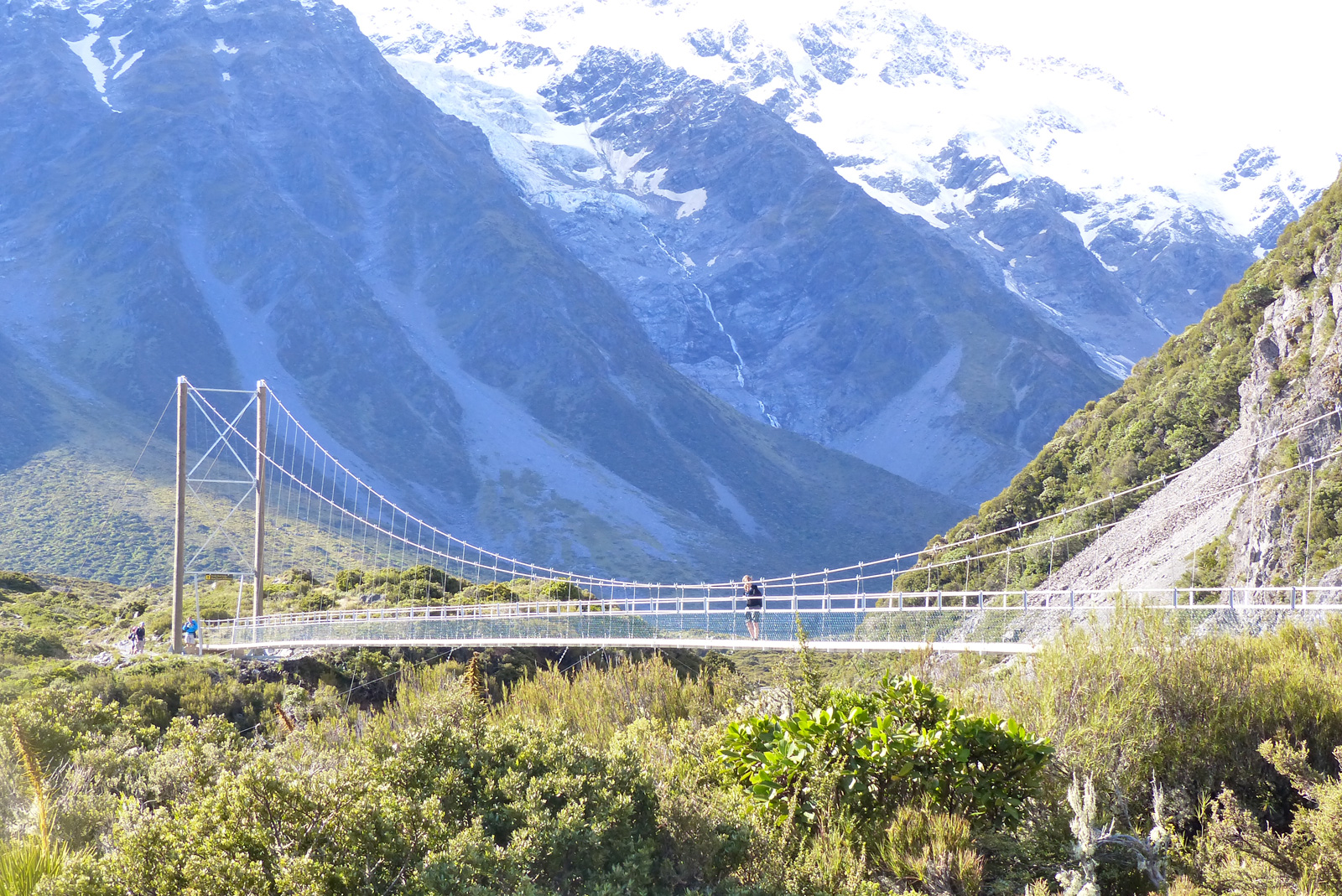 Nous reprenons la voiture direction le Hooker Valley track pour 2 heures de marche. Nous passons par deux grands ponts suspendus qui bougent quand même pas mal à cause du vent fort (la classique du glacier : du vent violent qui te déstabilise). Nous faisons un premier arrêt sur une vue sur le glacier du Mont Cook. Nous nous arrêtons ensuite devant une montagne sur laquelle se trouvent plusieurs cascades. Le chemin passe ensuite au milieu d’une rivière. Il faut sauter d’un rocher à l’autre pour avancer et essayer de ne pas tomber (les pneus avaient du mal à accrocher sur les algues, du coup j’ai eu droit à une petite glissade). Plus on s’enfonce, plus le chemin est sympa. La vue sur le glacier Hooker est juste trop belle !!! Même les nuages sont beaux. Ils prennent des formes improbables (de méduse, de génie qui sort de la lampe, etc).