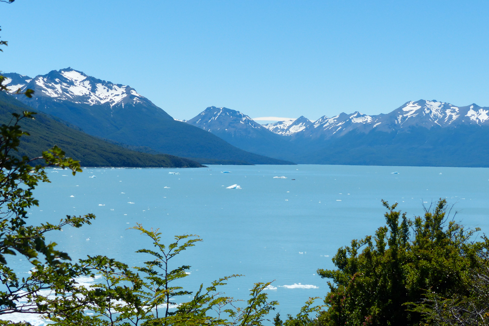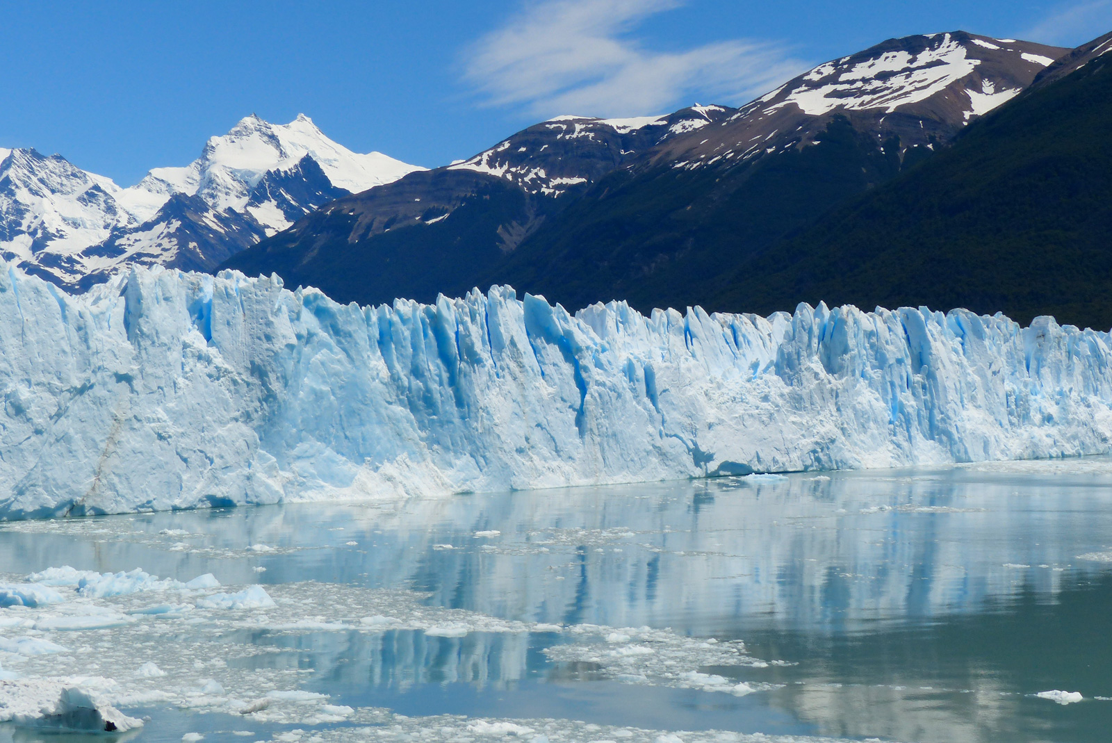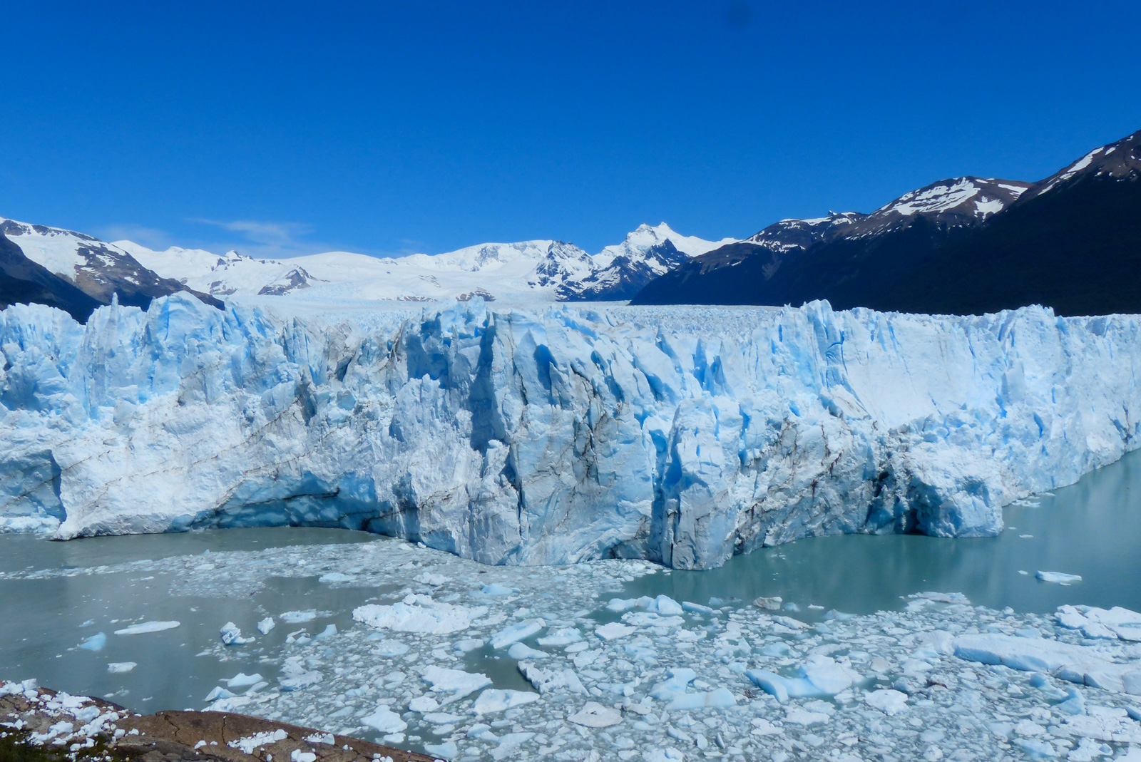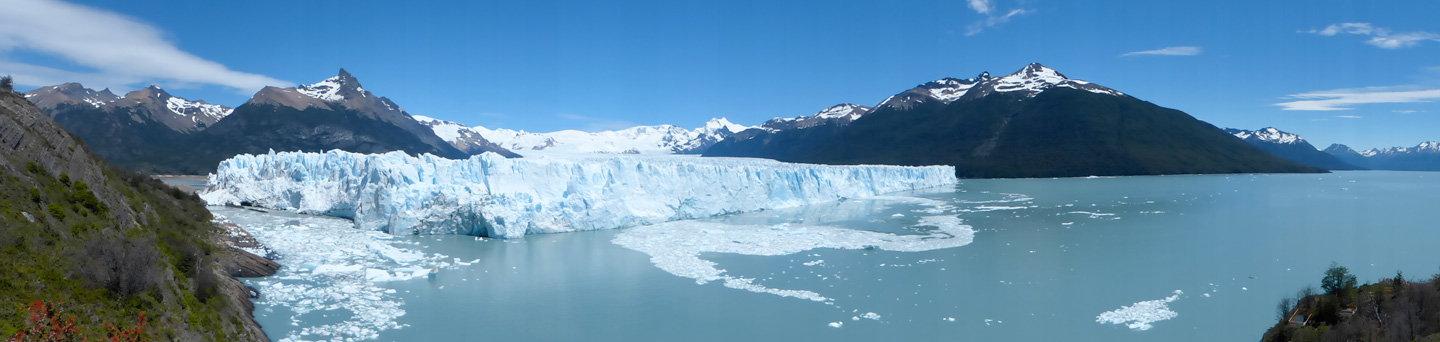 Nous partons de El Calafate, au Nord de la Patagonie Argentine, à 9h30 par un bus réservé la veille. Nous longeons les eaux turquoises du Lago Argentina dominées de montagnes enneigées. Nous avons de la chance le ciel est bleu, pas un seul nuage ! 1h de route plus tard on entre dans le parc national Los Glacieres, il faut payer 110$ AR de droits d’entrée (valable 1 journée, à repayer à chaque excursion dans le parc). Nous reprenons la route, et là au détour d’un virage… Le Perito Moreno !! Wahooooou ! Mimax et moi sommes toutes excitées. Le bus ouvre ses portes, on se précipite dehors comme des lions en cage.