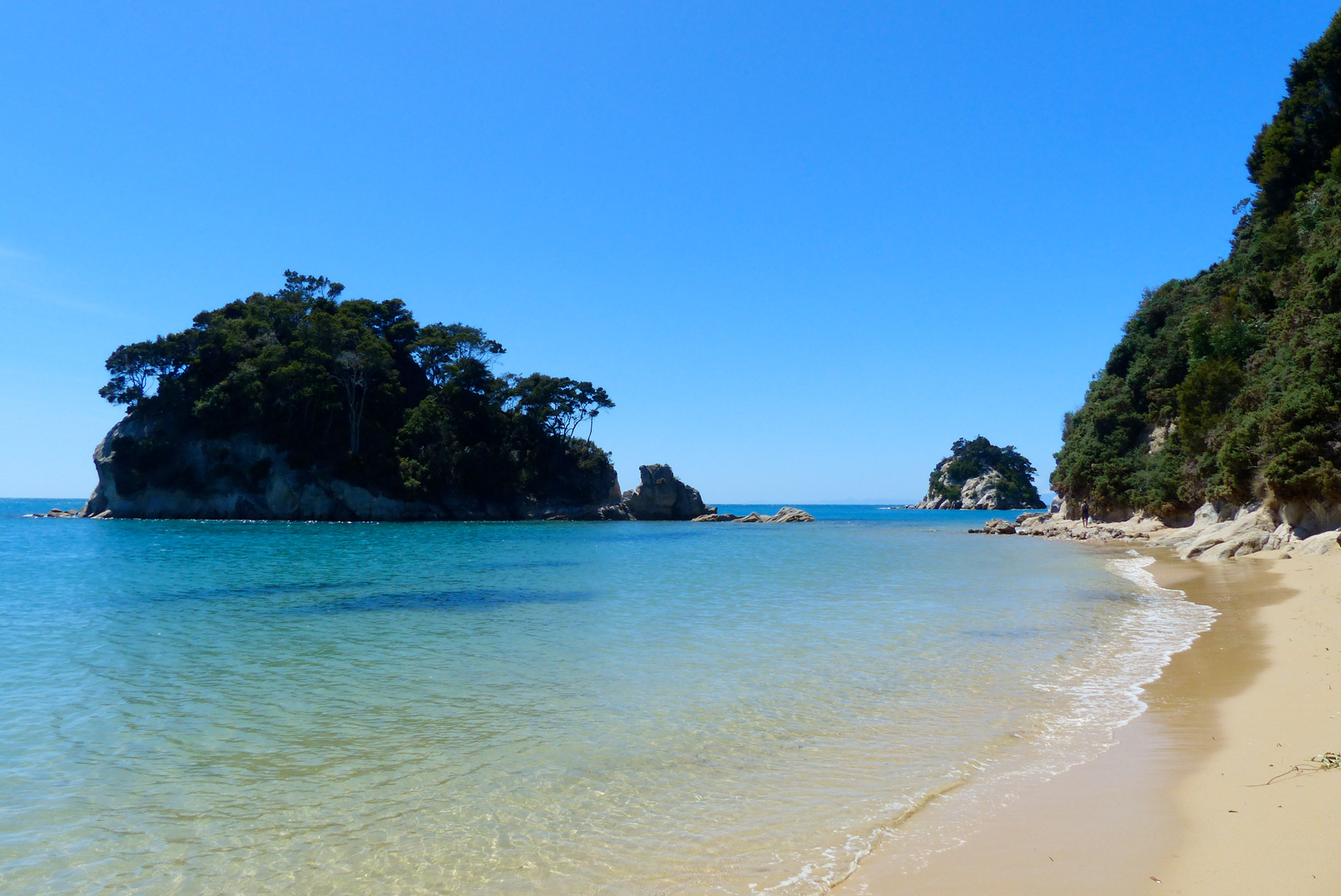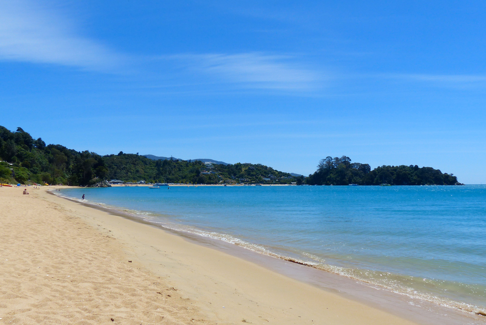 Alors que Mimax conduit, je fouille un peu dans notre guide et tombe sur une plage immanquable sur la route, Little Kaiteriteri. Je lui dépeint le tableau : sable fin blanc, eau turquoise,… Là notre cœur balance entre se faire une plage ou filer à Blenheim, la région des vignes, pour visiter quelques caves. Nous tombons vite d’accord, le mauvais temps nous poursuit depuis plusieurs jours, il faut sauter sur l’occasion. Aussi tôt dit, aussi fait ! Serviettes dépliées, tartinage de crème, doigts de pied en éventail. Aaaaaaah on n’est pas bien là ! L’eau est effectivement turquoise voir émeraude et quelques gros rochers recouverts de végétation agrémentent ce joli paysage. Par contre l’eau est froide ici, nous n’avons pas le courage de nous baigner.