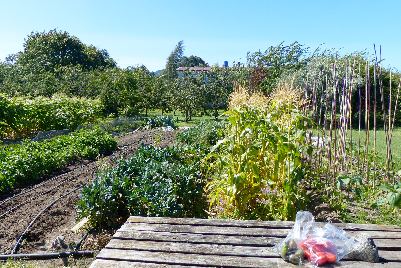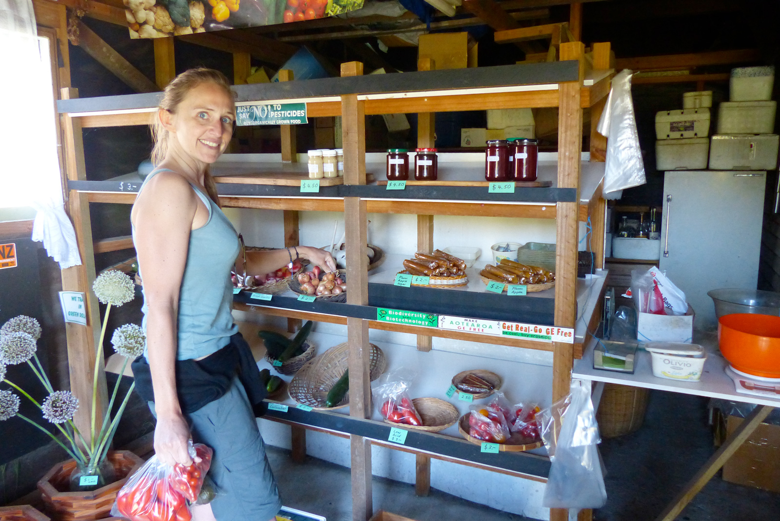 Un peu plus loin nous nous arrêtons dans un de ses petits marchands de fruits et légumes indiqués en bord de route. Au bout d’une petite route caillouteuse nous nous arrêtons près d’un beau potager. Nous poussons la porte de la cabane et là émerveillement : des petites tomates cerises, des prunes, des figues, … on n’a envie de tout prendre mais il faut être raisonnable. Nous payons dans la boîte à sous (il n’y a pas de vendeurs, tout est basé sur la confiance) et repartons ravies de nos emplettes.