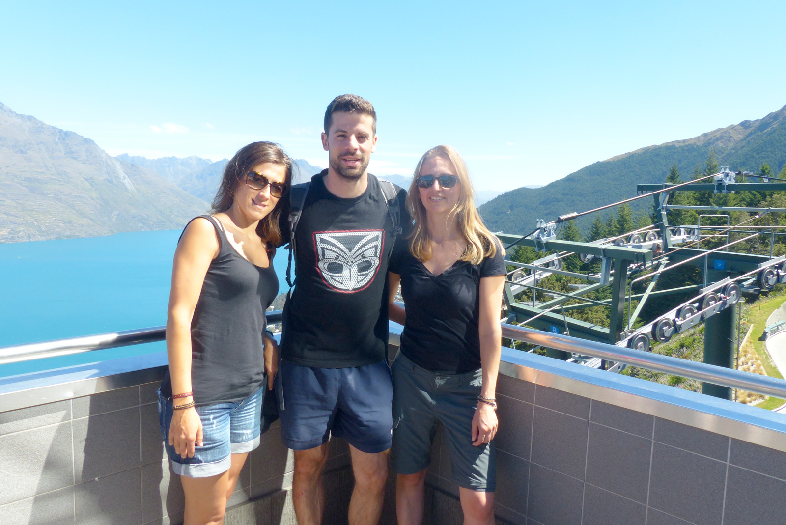 Le lendemain, c’est notre dernier jour chez Oli. Nous serions bien restées un peu plus… On décide de monter tout les trois en haut de la colline qui domine la ville. La gondola (le téléférique) coûte 27$NZ pour 10mn de montée. C’est exagéré selon nous et un peu de sport nous fera du bien. Nous grimpons durant 45 minutes dans la forêt et arrivons au panorama. C’est splendide, surtout avec ce beau soleil (2 jours de beau temps d’affilé, ça sent pas bon pour la suite…). D’en haut on a une belle vue sur la ville et le lac bleu turquoise. Ca valait vraiment le coup de se bouger un peu, et on s’est bien marrés en marchant (Oli si tu lis cet article, penses à aller récupérer ce que tu as oublié dans la forêt, ça peut un jour te servir ;-))….bref on a bien fait de se motiver !