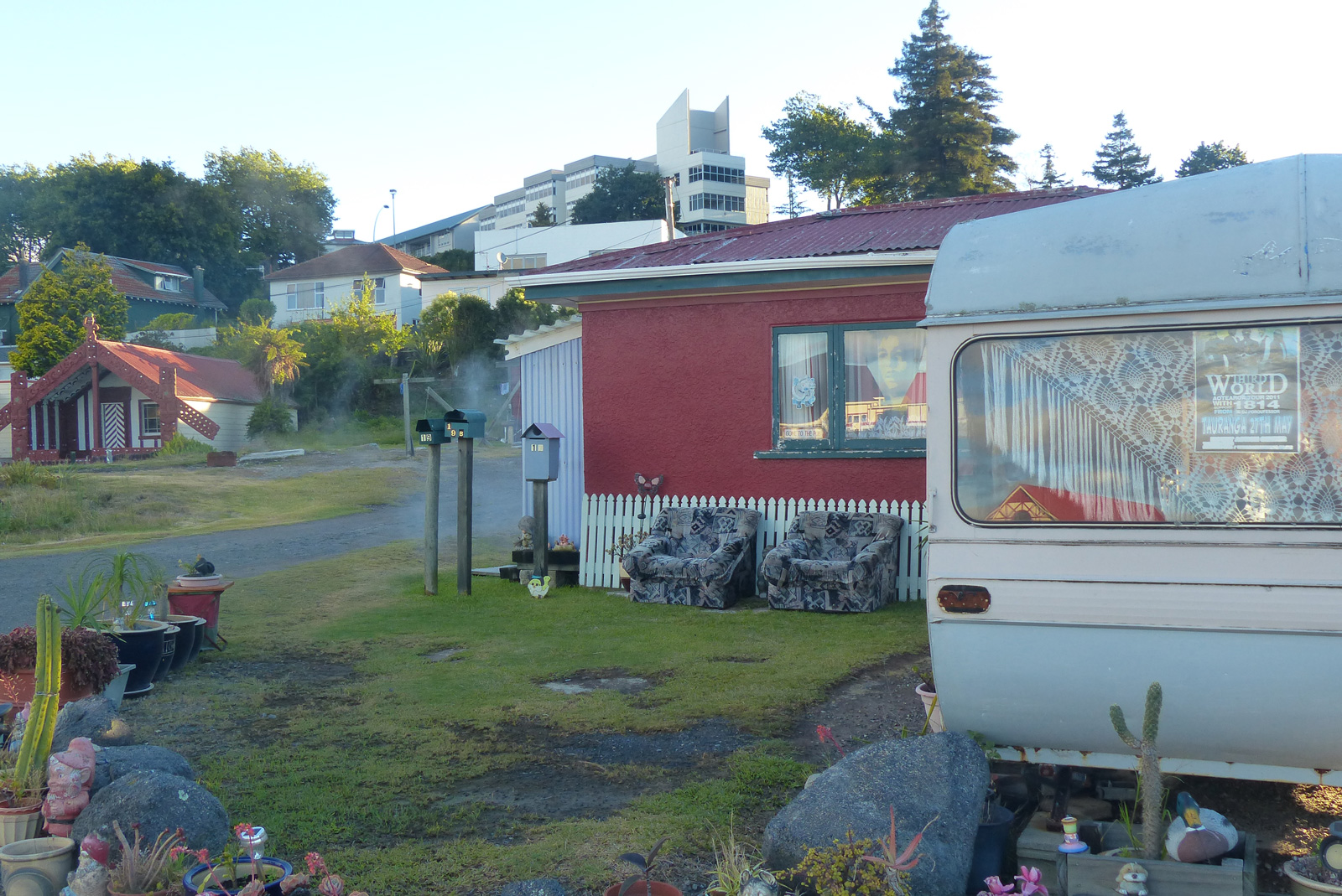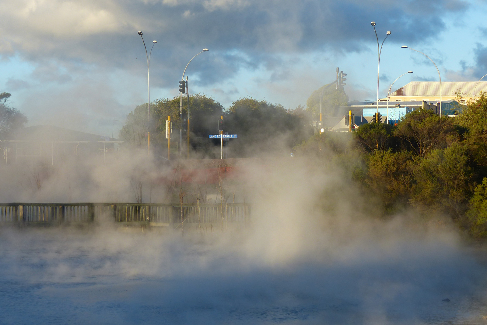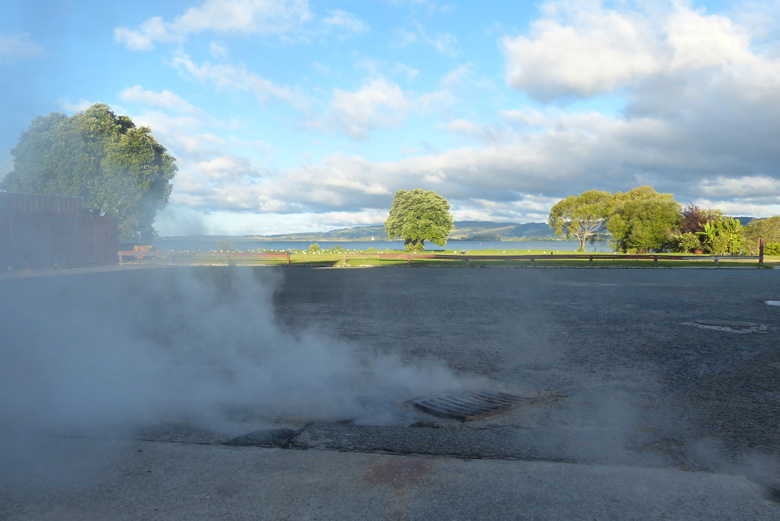 Nous voilà requinquées, on peut y aller ! Une odeur de souffre, omniprésente dans les rues, nous empeste les narines. On ne tarde pas à comprendre pourquoi. En se baladant près du lac nous voyons une bouche d’égout fumer comme à New York. On s’approche et là on entend et on voit de l’eau bouillir ! Euuuh mais que se passe-t-il ? Les traces de l’activité géothermique sont visibles en pleine ville! C’est impressionnant de se dire que l’on marche sur une cocote minute. Nous n’arrêtons pas de nous étonner car à chaque pâté de maison c’est pareil : des trous dans le bitume et des cavités qui fument dans les jardins des maisons individuelles, des résurgences d’eau bouillonnante,… Même le lac lui fume ! On avance un peu plus dans le quartier résidentiel qui semble en grande partie peuplé par les Maori. Pour preuve les jeunes enfants qui sculptent du bois sur la plage et le petit bateau typique amarré au bord de l’eau.