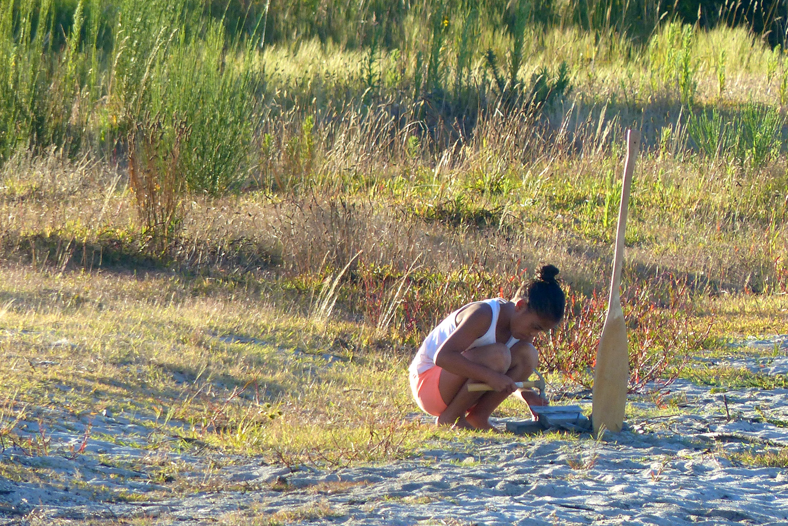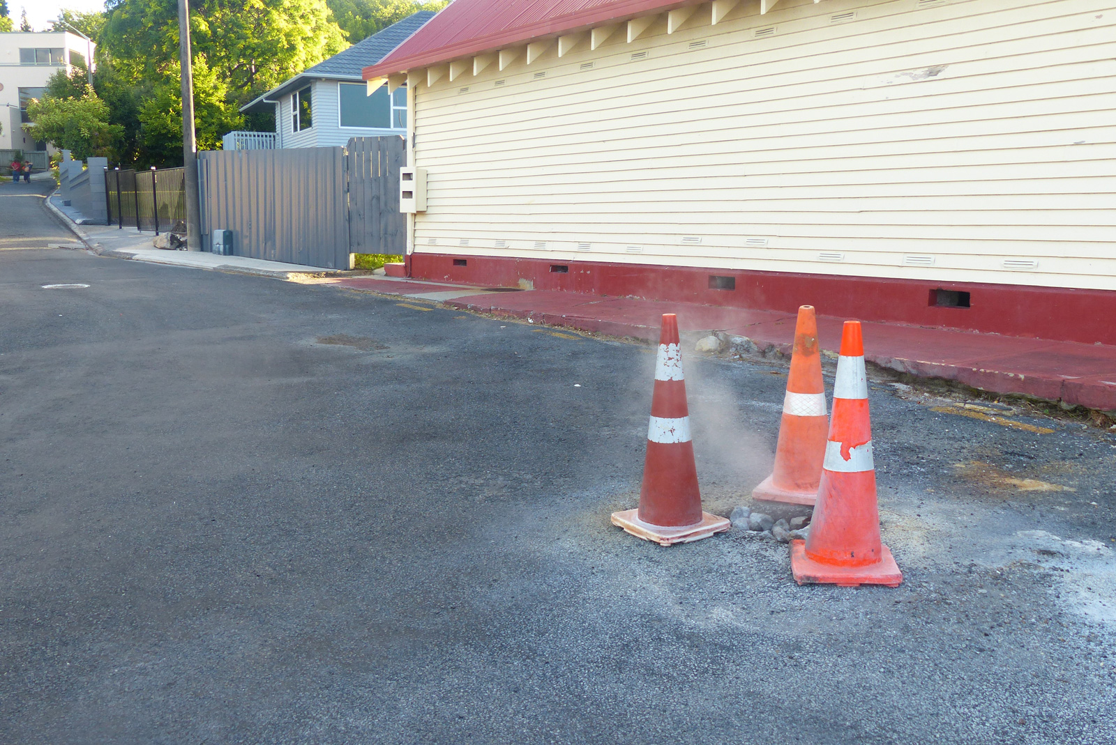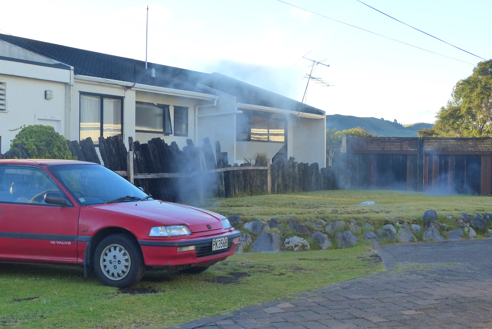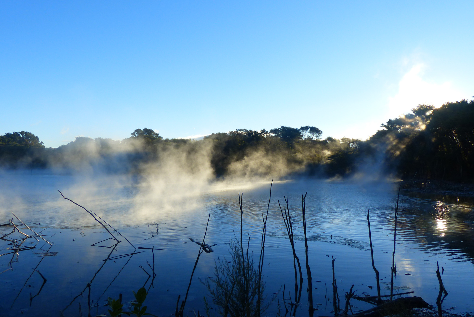 Nous voilà requinquées, on peut y aller ! Une odeur de souffre, omniprésente dans les rues, nous empeste les narines. On ne tarde pas à comprendre pourquoi. En se baladant près du lac nous voyons une bouche d’égout fumer comme à New York. On s’approche et là on entend et on voit de l’eau bouillir ! Euuuh mais que se passe-t-il ? Les traces de l’activité géothermique sont visibles en pleine ville! C’est impressionnant de se dire que l’on marche sur une cocote minute. Nous n’arrêtons pas de nous étonner car à chaque pâté de maison c’est pareil : des trous dans le bitume et des cavités qui fument dans les jardins des maisons individuelles, des résurgences d’eau bouillonnante,… Même le lac lui fume ! On avance un peu plus dans le quartier résidentiel qui semble en grande partie peuplé par les Maori. Pour preuve les jeunes enfants qui sculptent du bois sur la plage et le petit bateau typique amarré au bord de l’eau.