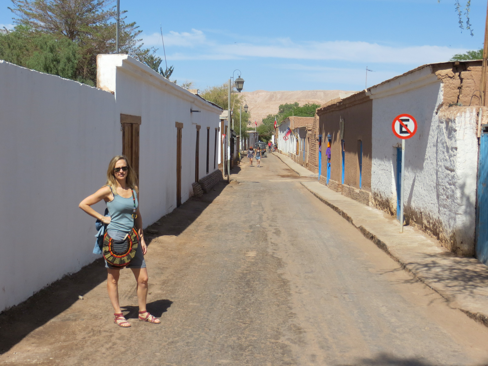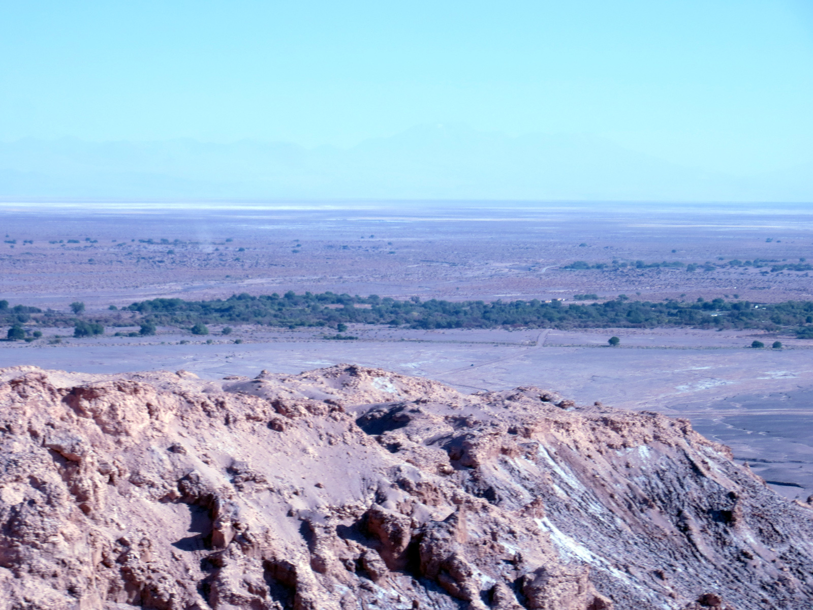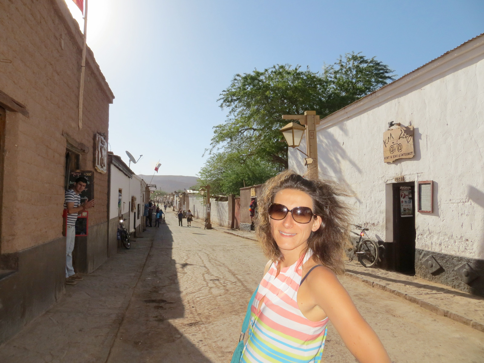 La route dure environ 1h15, au milieu du désert (seules des éoliennes peuplent le parcours). Au bout de quelques virages dans un paysage lunaire, nous apercevons enfin un peu de vert à l’horizon, une sorte d’oasis au milieu du désert, c’est San Pedro. Ce petit village qui ne vit quasiment que du tourisme se trouve niché entre les montagnes, le volcan Licancabur et le Salar d’Atacama.