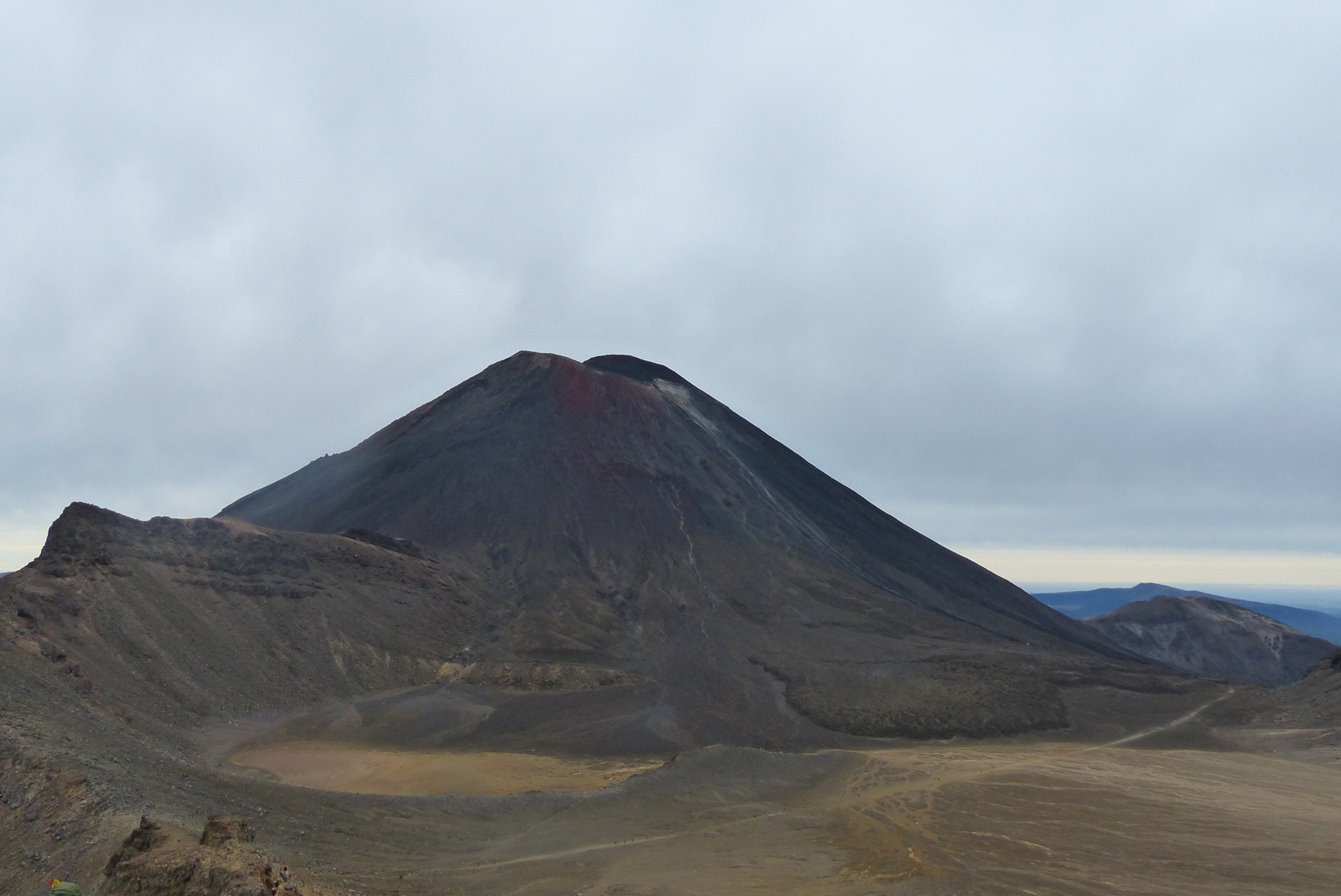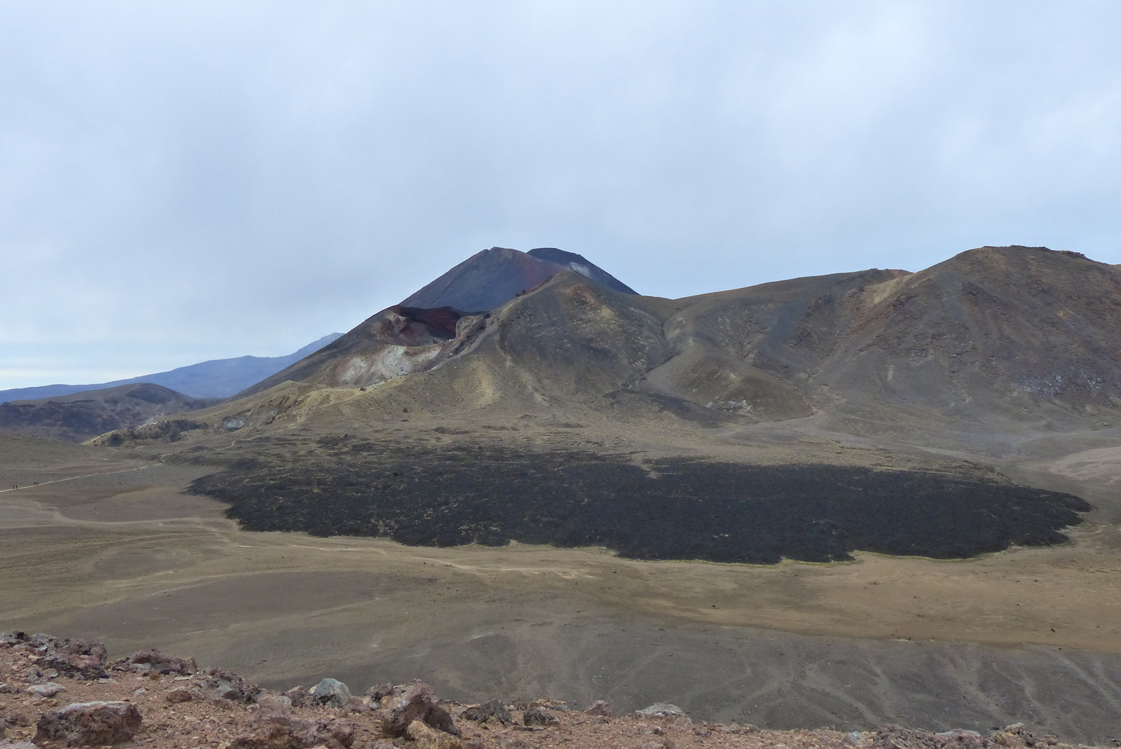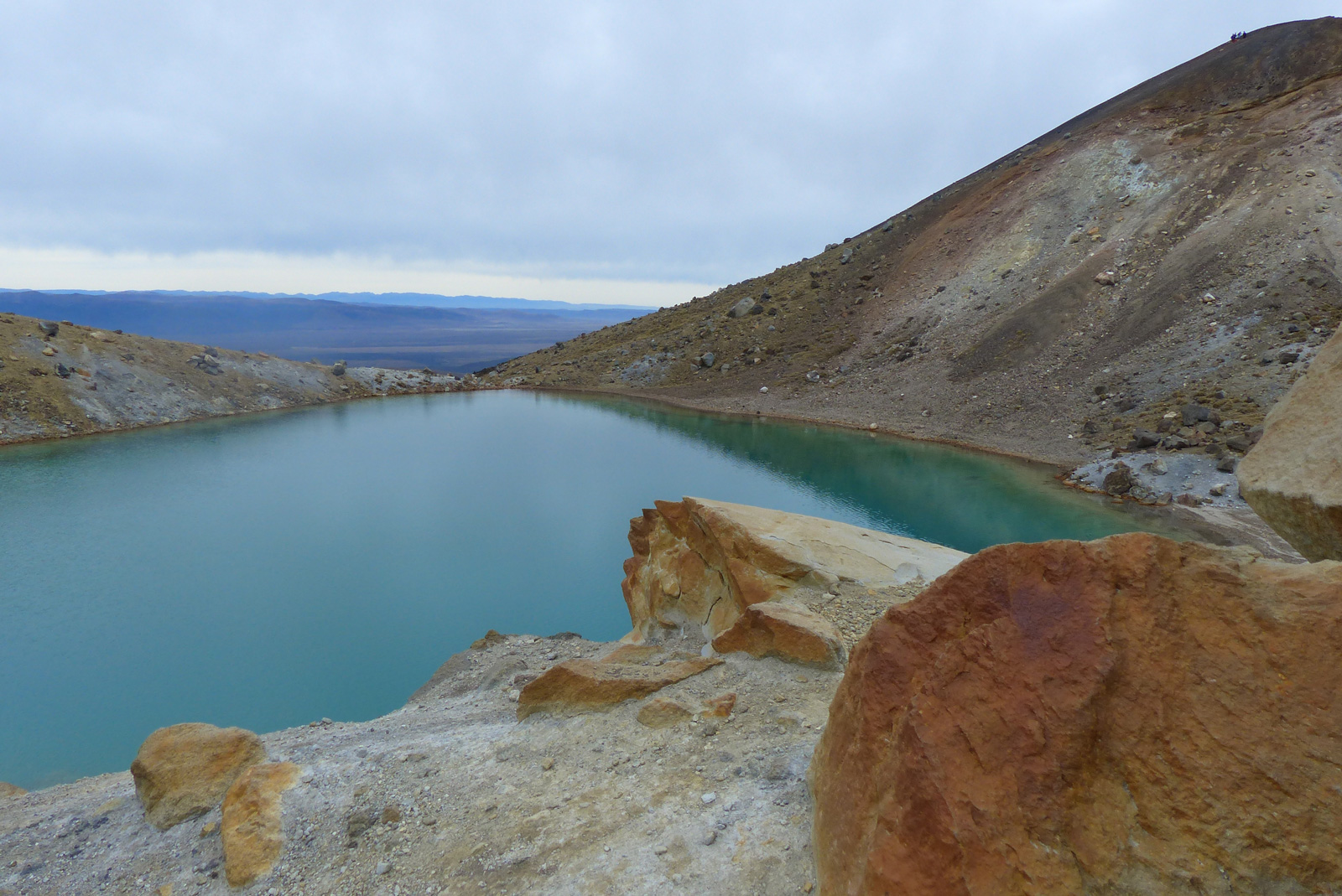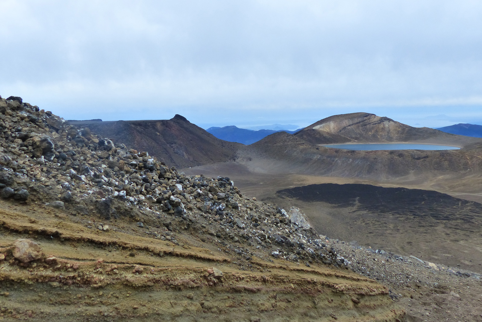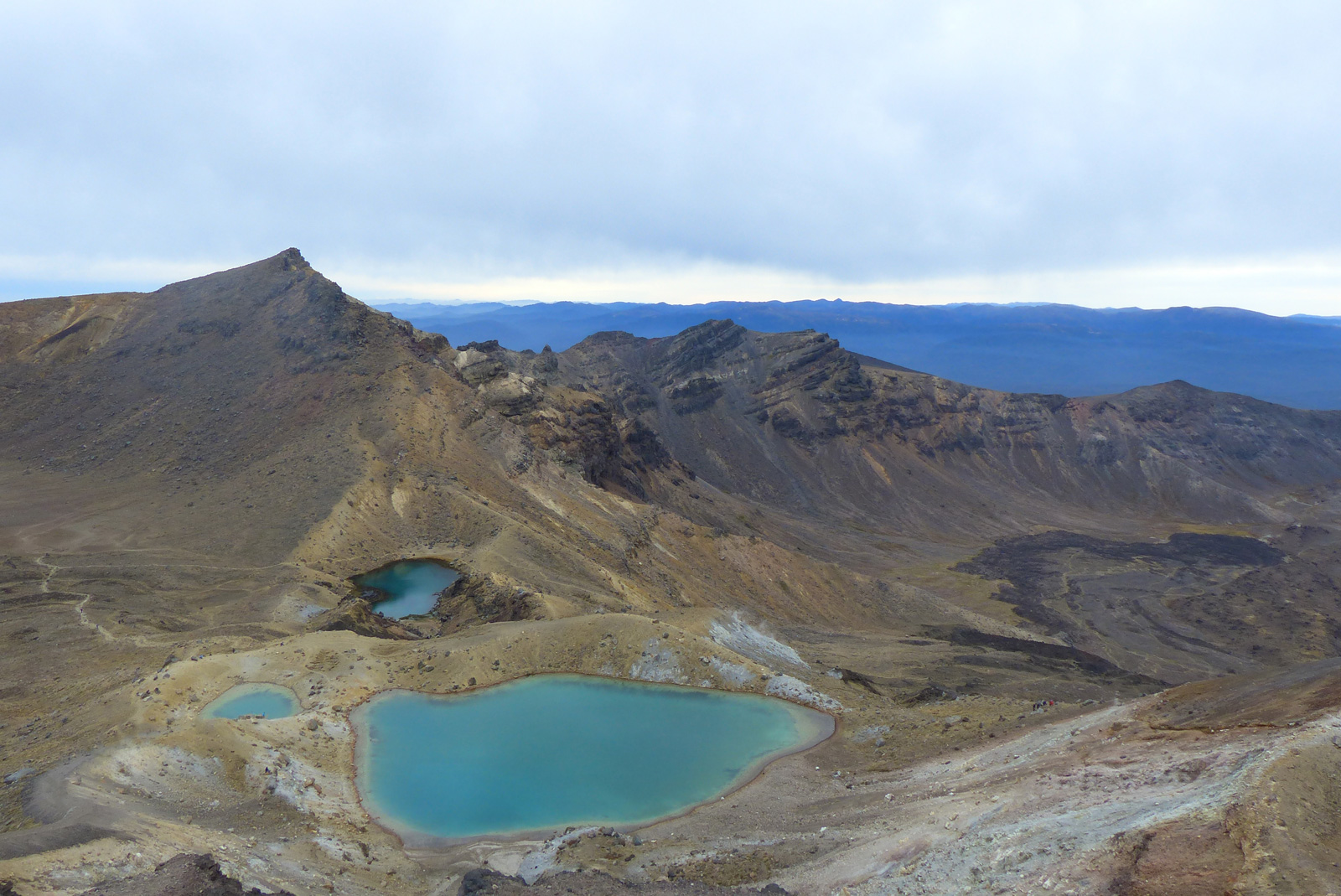 Nous démarrons cette marche très motivées puisque plusieurs personnes rencontrées nous l’ont conseillée. Pas de chance il ne fait pas super beau ce jour là. Nous faisons les 4 premiers km au radar, la machine a du mal à démarrer ce matin, mais « emportées par foule » nous avançons tout de même d’un bon pas. On nous avait prévenu, nous sommes parties pourtant tôt pour l’éviter mais cela n’a pas suffit : il y a beaucoup de monde (les galeries Lafayette un premier jour de soldes). Le chemin est bien balisé au départ et pour monter au premier cratère il y a des marches à ne plus en finir (les marches ça cassent les jambes mais ça fait des fesses en béton… c’est un peu notre leitmotiv du jour !). On passe ensuite par un endroit un peu plat, Soda Springs. Ca fait du bien ! Sur ce plateau, d’un côté on dirait le décor lunaire de star wars et de l’autre le volcan Ngauruhoe qui a été choisi pour incarner la « montagne du destin » dans le Seigneur des Anneaux. Un peu plus loin nous voyons comme des fourmis, à non ce sont des gens qui montent en ligne le long de la crête jusqu’à la « Mangatepopo Saddle » … et où nous allons. Alors là, pour le coup, la montée se fait dans les éboulis (et la descente de l’autre côté dans du sable). D’en haut, on a un beau panorama des environs et une jolie vue sur le Red Crater. Comme son nom l’indique, la roche est rouge par endroit. En dessous, nous apercevons différents lacs d’une jolie couleur turquoise, les Emerald Lakes. Les bords de ces lacs sont jaunes à cause du souffre. C’est vraiment très beau.