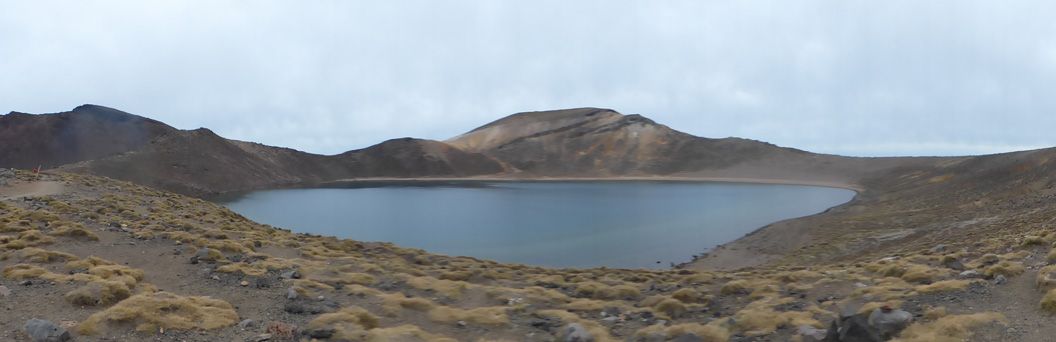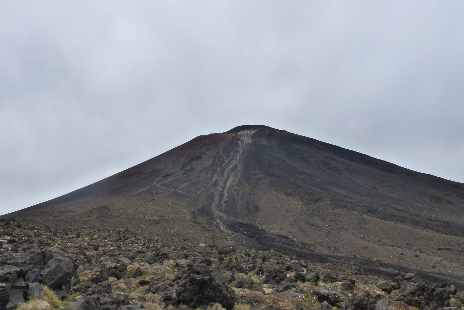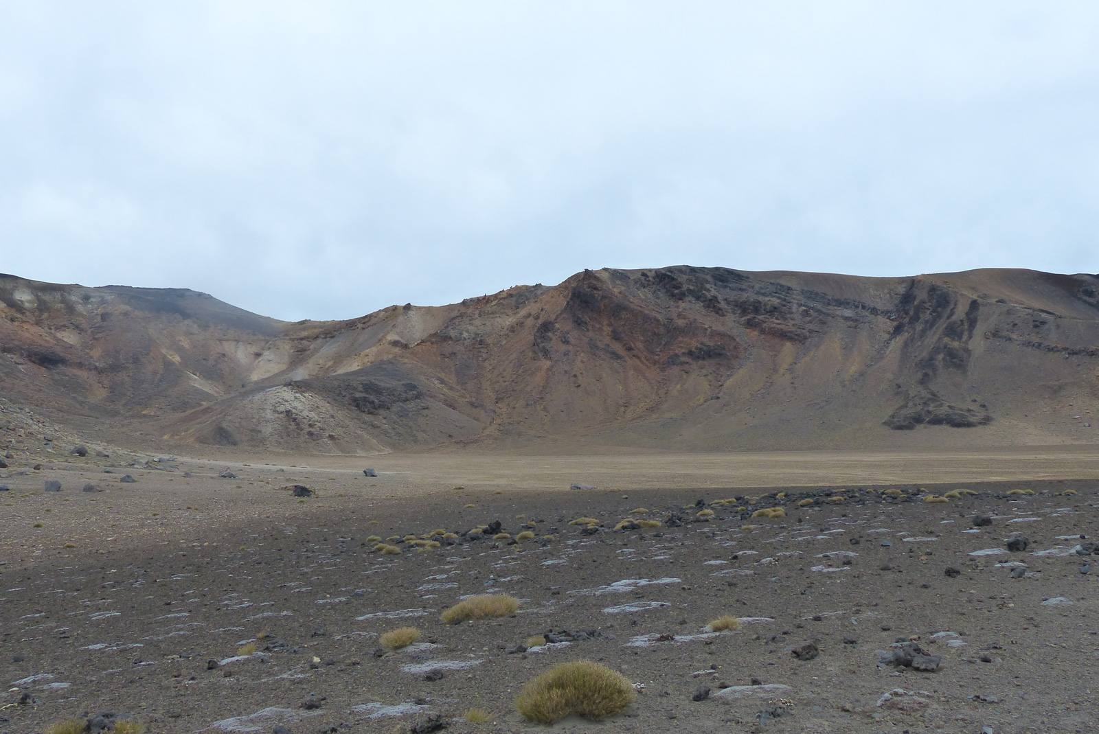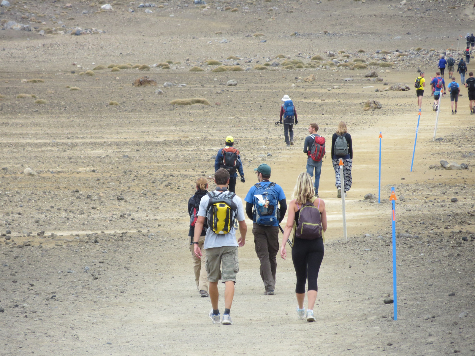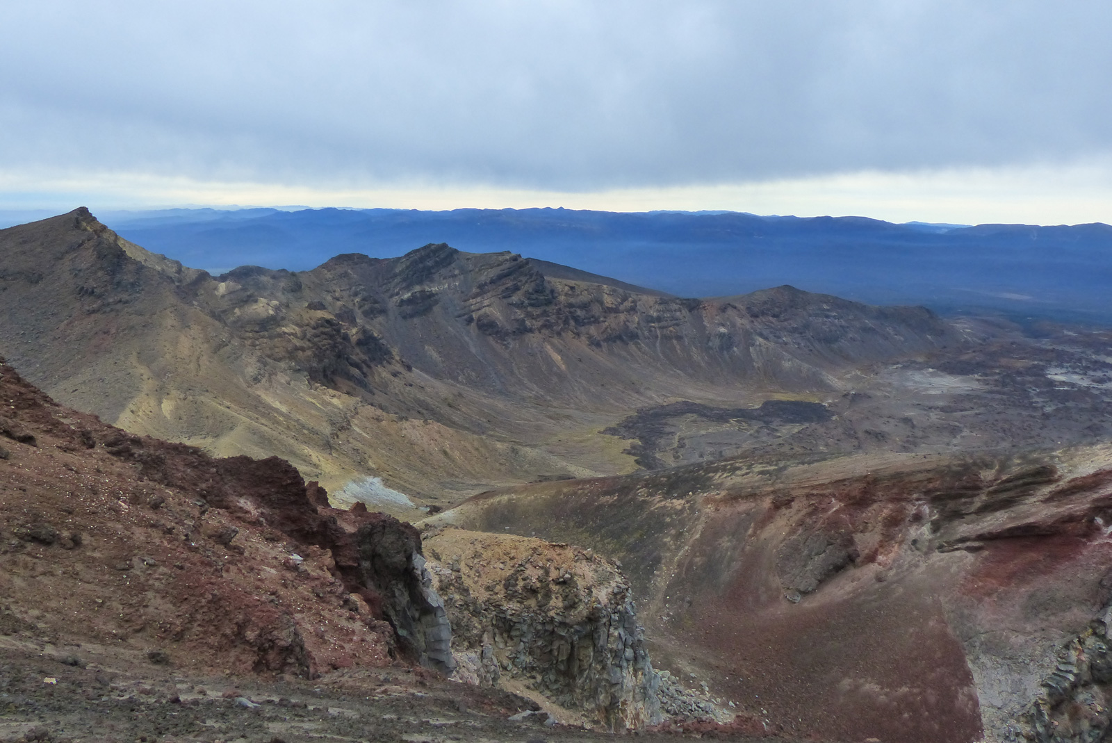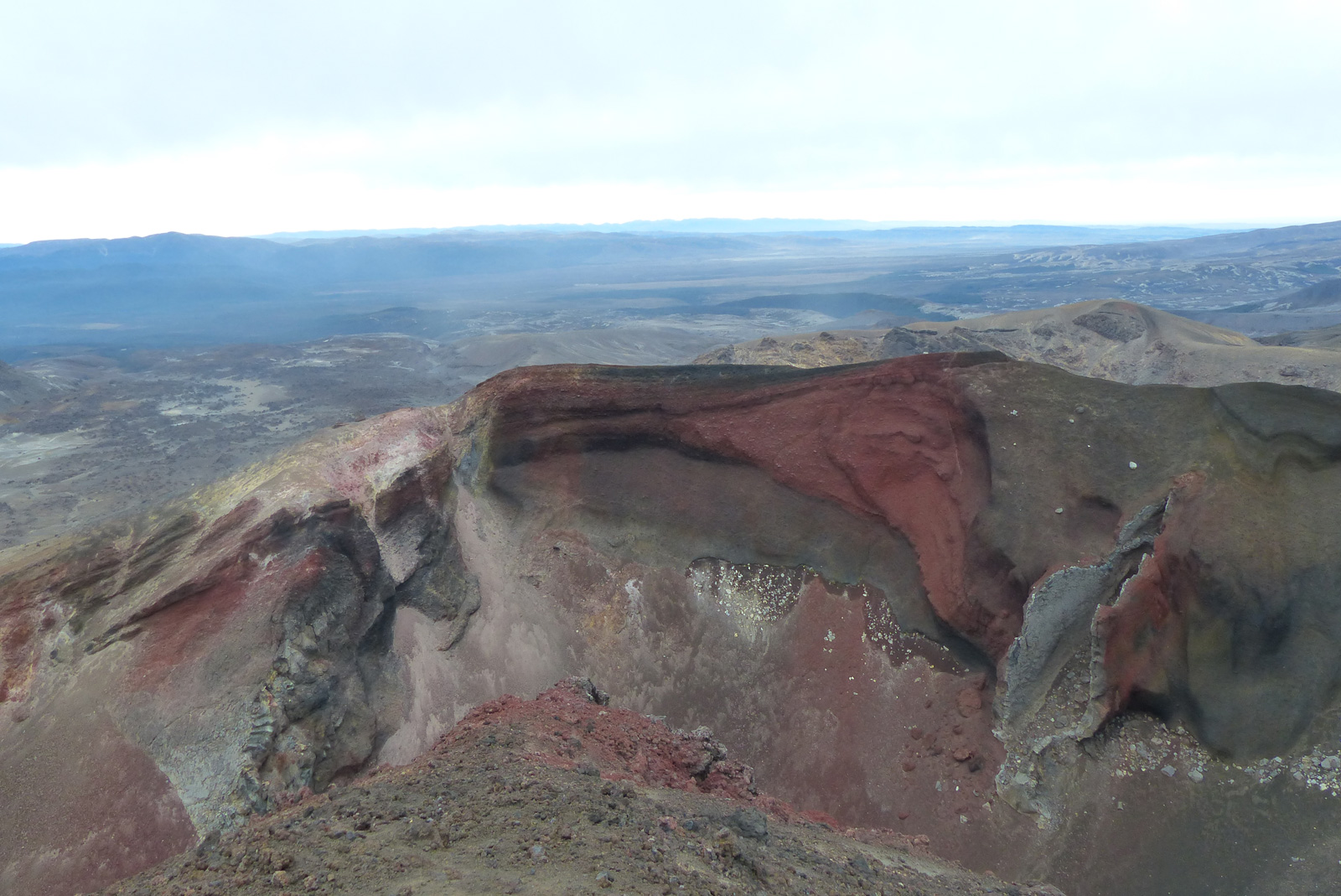 Nous démarrons cette marche très motivées puisque plusieurs personnes rencontrées nous l’ont conseillée. Pas de chance il ne fait pas super beau ce jour là. Nous faisons les 4 premiers km au radar, la machine a du mal à démarrer ce matin, mais « emportées par foule » nous avançons tout de même d’un bon pas. On nous avait prévenu, nous sommes parties pourtant tôt pour l’éviter mais cela n’a pas suffit : il y a beaucoup de monde (les galeries Lafayette un premier jour de soldes). Le chemin est bien balisé au départ et pour monter au premier cratère il y a des marches à ne plus en finir (les marches ça cassent les jambes mais ça fait des fesses en béton… c’est un peu notre leitmotiv du jour !). On passe ensuite par un endroit un peu plat, Soda Springs. Ca fait du bien ! Sur ce plateau, d’un côté on dirait le décor lunaire de star wars et de l’autre le volcan Ngauruhoe qui a été choisi pour incarner la « montagne du destin » dans le Seigneur des Anneaux. Un peu plus loin nous voyons comme des fourmis, à non ce sont des gens qui montent en ligne le long de la crête jusqu’à la « Mangatepopo Saddle » … et où nous allons. Alors là, pour le coup, la montée se fait dans les éboulis (et la descente de l’autre côté dans du sable). D’en haut, on a un beau panorama des environs et une jolie vue sur le Red Crater. Comme son nom l’indique, la roche est rouge par endroit. En dessous, nous apercevons différents lacs d’une jolie couleur turquoise, les Emerald Lakes. Les bords de ces lacs sont jaunes à cause du souffre. C’est vraiment très beau.