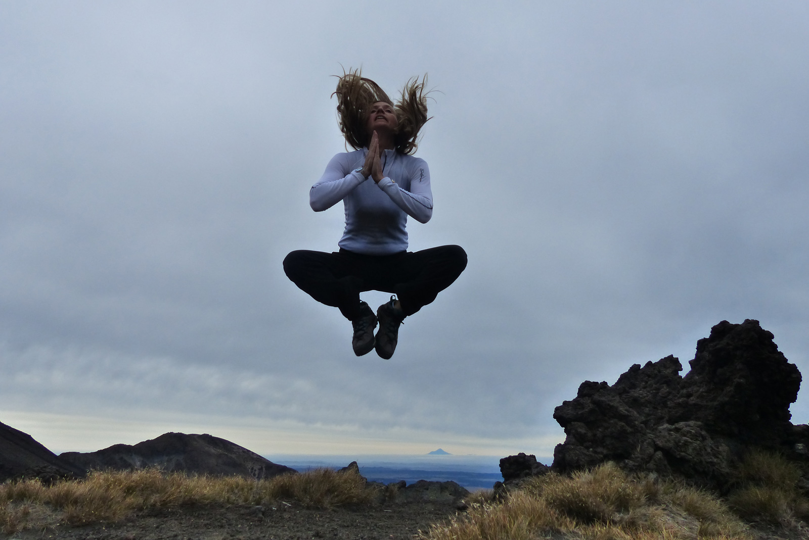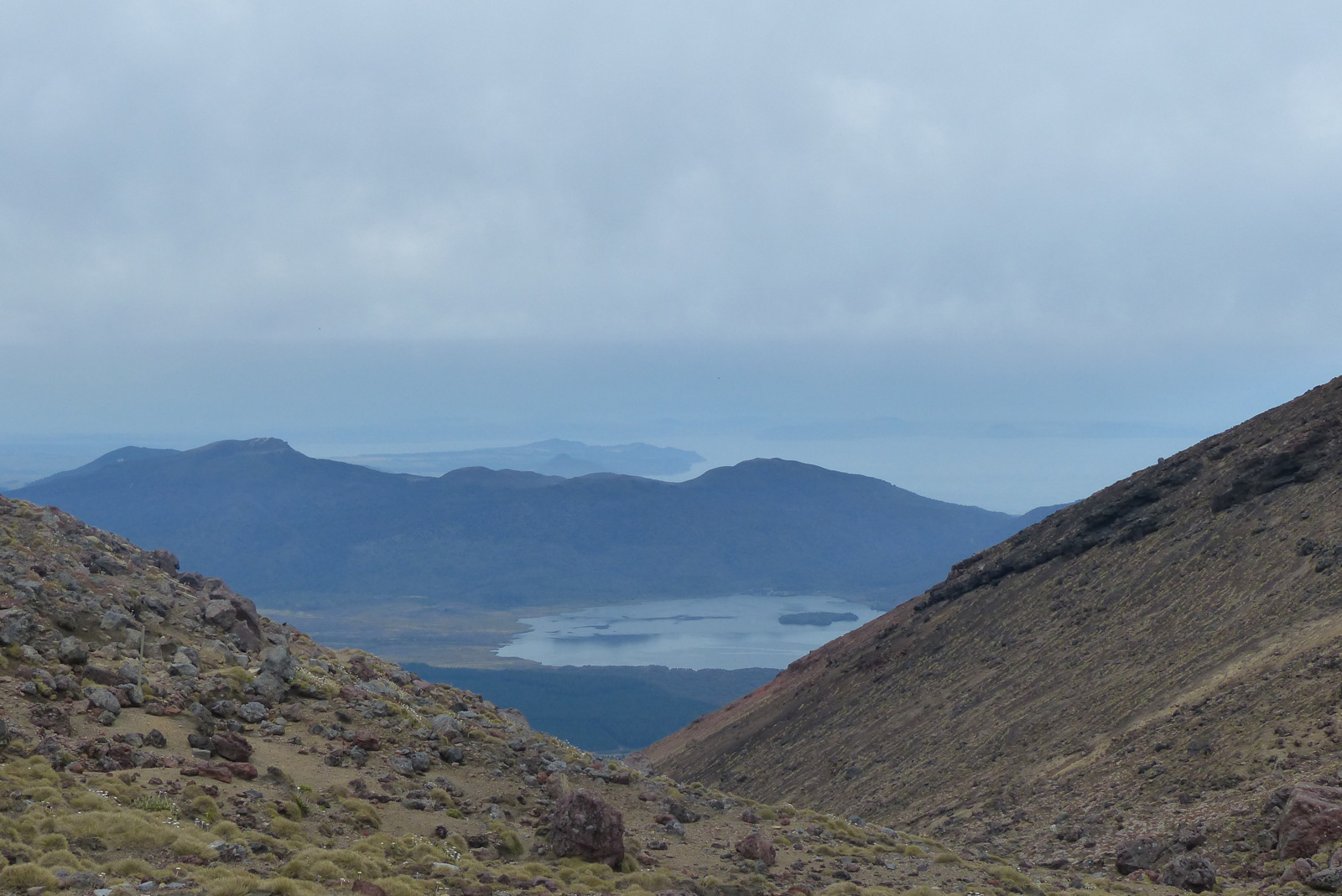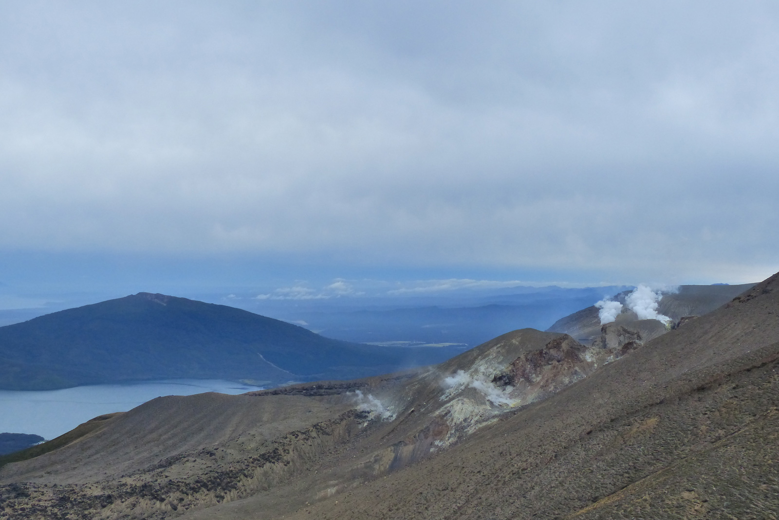 Nous poursuivons en longeant la caldeira et ses coulées de laves et le Blue Lake. Me tout dans un décor lunaire de roches volcaniques. La partie la plus intéressante est derrière nous, mais il reste 10 km à faire. Nous atteignons alors le fameux point à partir duquel nous entrons dans une zone dangereuse. 400 mètres après nous apercevons la vallée un peu plus bas avec le lac Taupo en arrière plan et des fumeroles sur les parois du volcan. En contre bas, il y a un endroit pour s’arrêter pour faires ses besoins et manger un morceau. Vu la tête des filles qui sortent des wc et leurs commentaires on se dit qu’on ne vas pas tester (Vyrg se souvient encore de l’épisode en Bolivie et a trop peur que je sois encore malade). De même on ne va pas s’arrêter manger car ça sent l’oeuf pourri. Donc nous poursuivons. La descente n’est pas très intéressante du coup on trace. Ainsi, le parcours qu’ils annoncent en 8h de marche, nous on l’a fait en 6h (trop forte les filles !!! car même si nous avons tracé sur la fin, sur le reste du chemin nous avons pris notre temps pour prendre les photos). Nous arrivons donc en avance (il se met toute juste à pleuvoir, quel sens du timing !) et devons attendre notre bus. L’arrivée et le départ se font de deux parking différents et assez éloignés, nous avons donc été obligées de prendre un bus (réservé via notre hostel). En attendant, nous entendons les gens arrivés hyper fiers d’eux d’avoir réussi à faire cette boucle. Ils se congratulent entre eux, c’est assez drôle ! Nous nous reposons car ensuite nous devons prendre la route pour aller à Waitomo, qui est soit disant un incontournable, enfin soit disant …