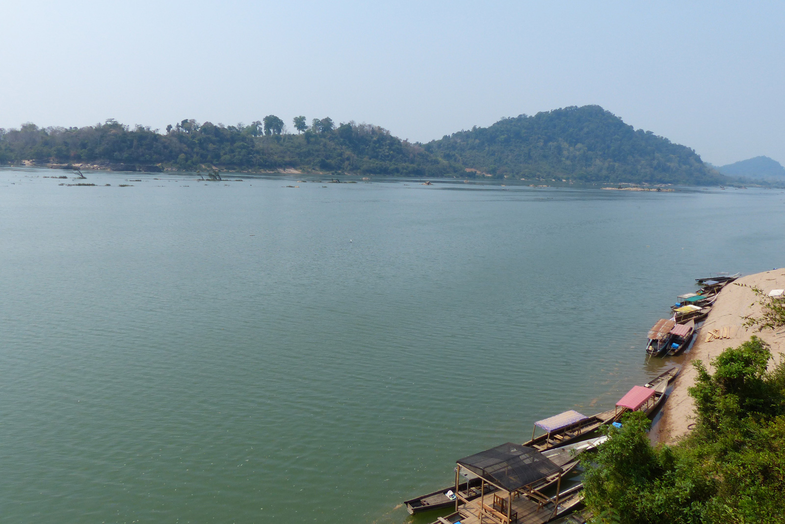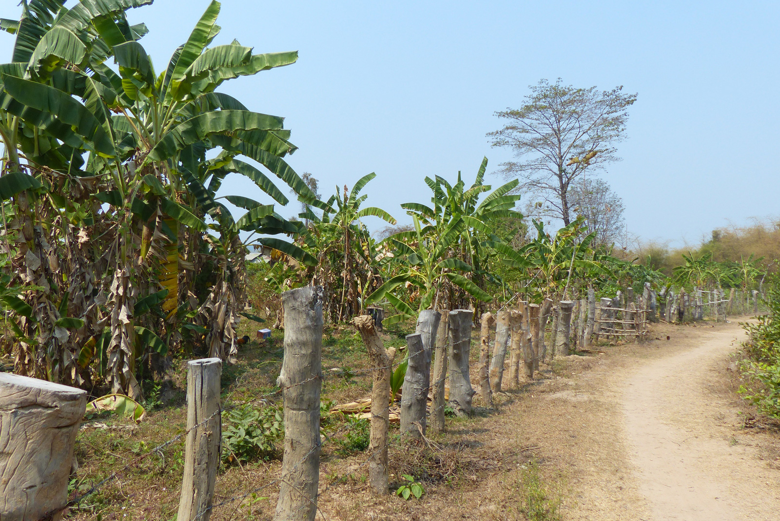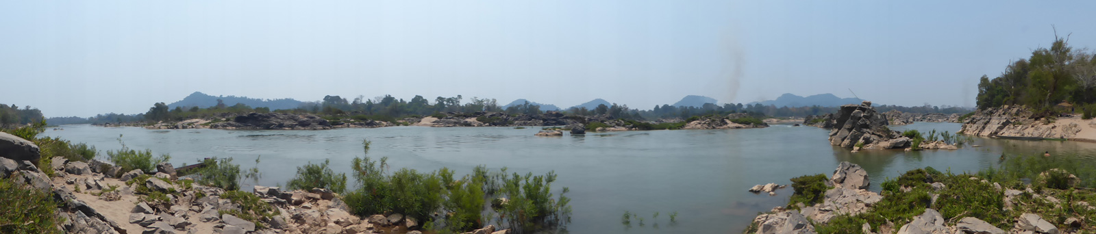 Nous continuons tout droit, sur l’ancien tracé de cette voie ferrée pour atteindre la pointe sud de l’île. Le panorama à 180 degrés qui s’offrent à nous est splendide. Ici le Mékong ressemble plus à un lac qu’à un fleuve. Les collines en face de nous, c’est le Cambodge où nous étions encore il y a quelques jours.