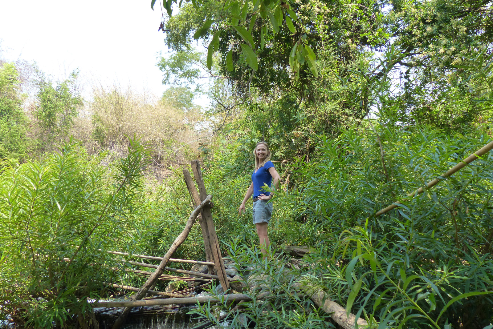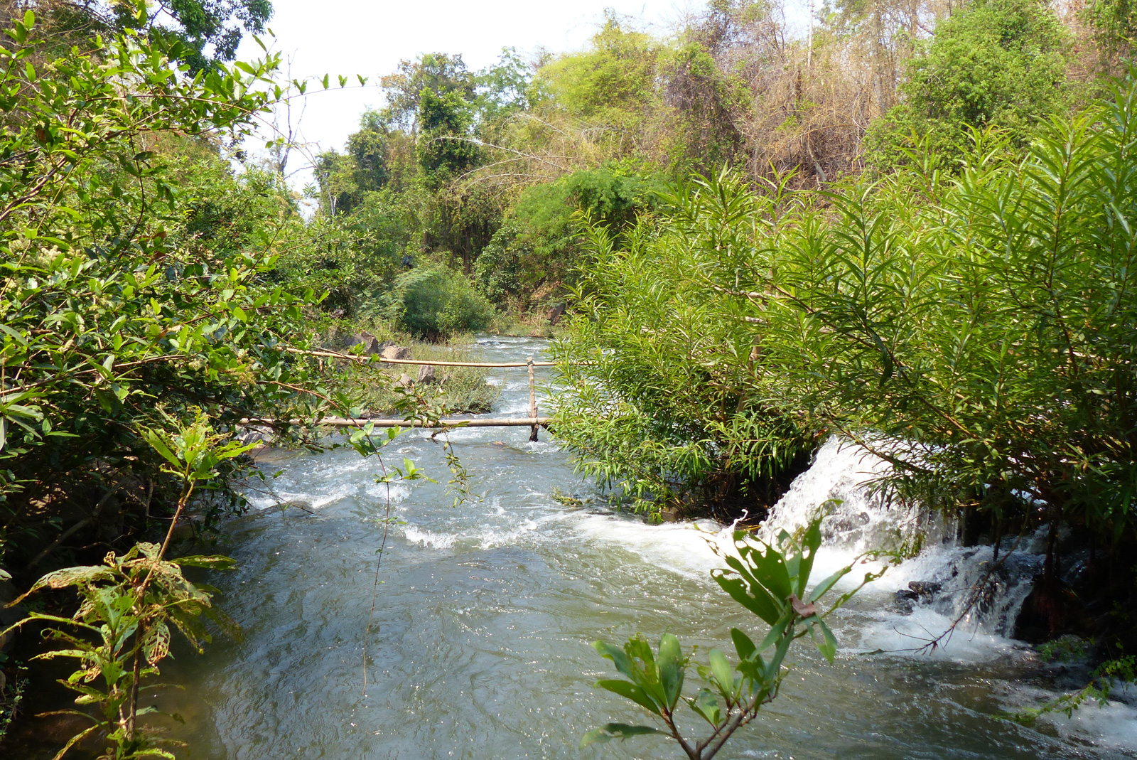 Christian nous mène dans un sous bois qu’il a découvert la veille. Nous voyons le Mékong à nouveau sous un autre jour, on se croirait au bord d’un torrent de montagne. La végétation est bien verte ici et il fait un peu plus frais (enfin tout est relatif). Nous passons un petit moment ici, le temps de tremper les pieds et de jouer les équilibristes sur les bambous installés par les locaux pour passer d’un côté à l’autre de la rive.