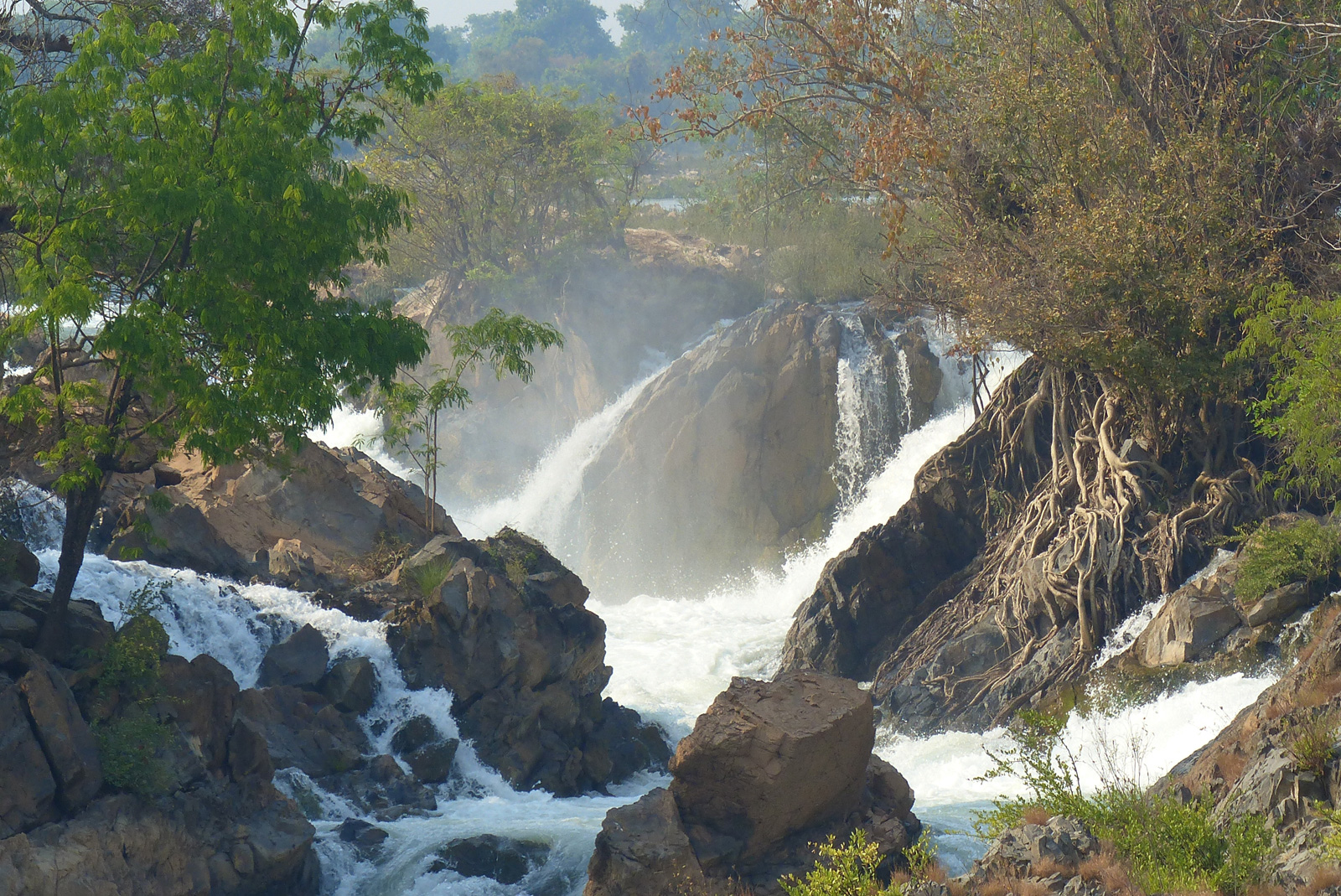 Pour digérer nous montons la côte que l’on avait descendue en arrivant. Sauf que là on est en pleine digestion et qu’il fait trèèèèèès chaud. Ouf on est en haut ! En route pour la dernière cascade de la journée, Somphamit Waterfall. Nous laissons nos vélos à l’entrée du site et l’on poursuit à pied. Nous arrivons sur un point de vue et là nous restons ébahis devant ces immenses chutes d’eau et ces roches rouges. L’eau arrive de toute part ! Des milliers de litres se déversent dans un même canyon dans un bruit infernal . Encore une autre face du Mékong !