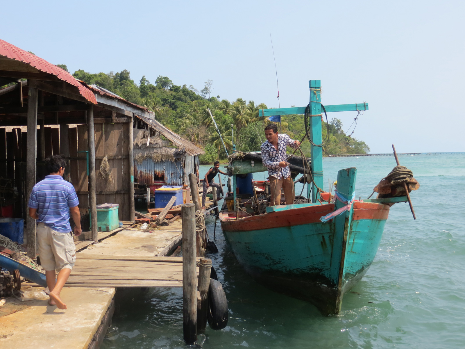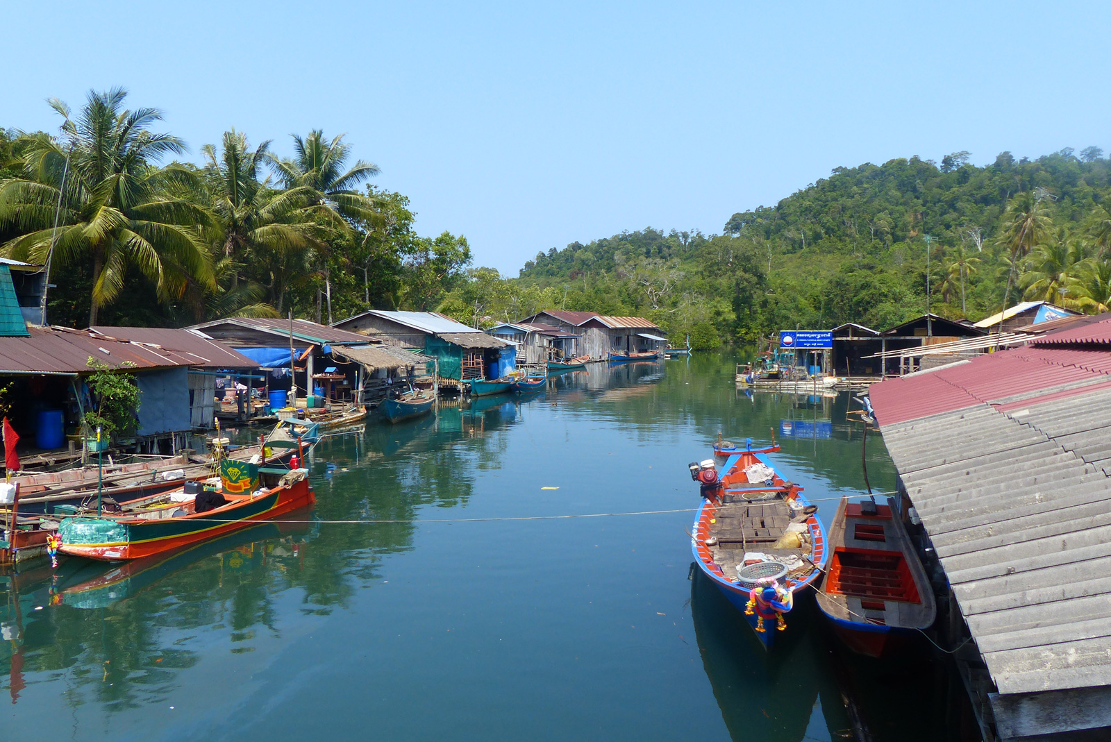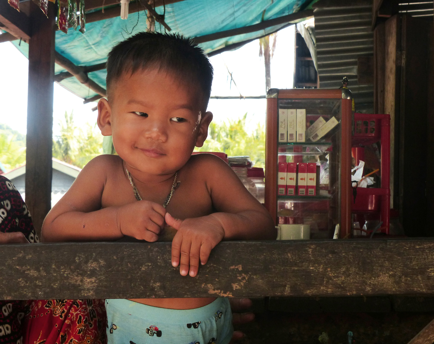 Nous avançons dans ce charmant petit village. Les gens nous saluent et sourient. Nous nous arrêtons un moment près de la petite échoppe d’une dame avec son petit garçon. Il est trop craquant à nous faire des sourires avec sa petite fossette. Bon ok on a craqué on l’avoue… Un peu plus loin nous traversons un petit pont de bois (qui ne tenait plus guerre…) pour traverser une rivière. Le village est en fait construit autour d’une mangrove. Nous sommes dans un vrai village de pêcheurs : les bateaux, les filets, les poissons séchés ornent le paysage.