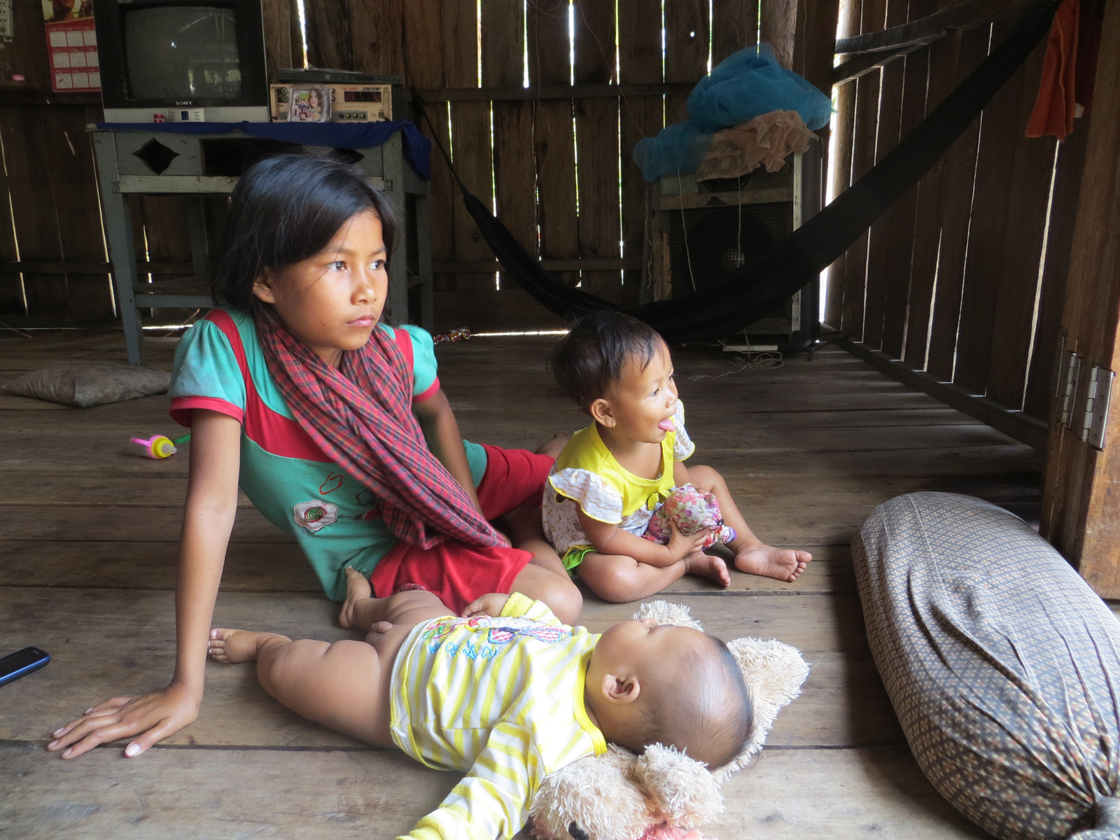 En revenant à l’entrée du village, nous sommes toute étonnées de retrouver notre petit guide. Il est vraiment gentil, il nous a attendu. Il nous invite à entrer un moment dans la maison de son frère pour nous reposer. Nous acceptons avec plaisir et découvrons l’intérieur d’une maison Khmer. C’est très sommaire, il y a une seule pièce, tout est en bois et la cuisine se résume à une planche sur des parpaings.