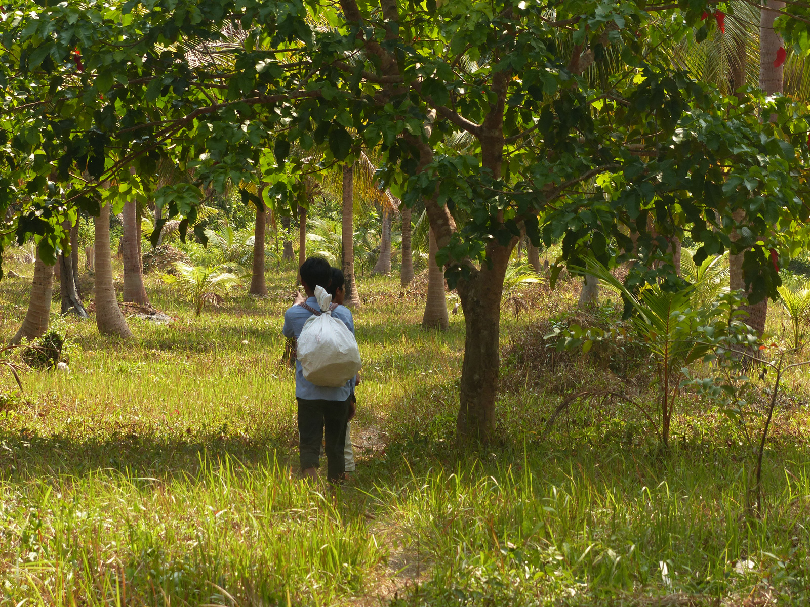 Après 10 minutes de marche première embûche, le chemin se divise en deux. Gauche ou droite ?! On tire à pile ou face et nous prenons à gauche. Nous croisons alors 2 jeunes cambodgiens dont un qui parle anglais et nous demande où nous allons. Eux aussi vont au village, ils nous invitent à les suivre. Cool on a trouvé un guide !