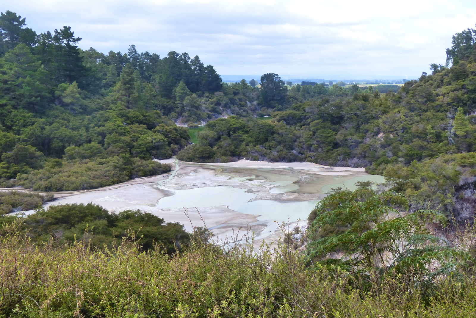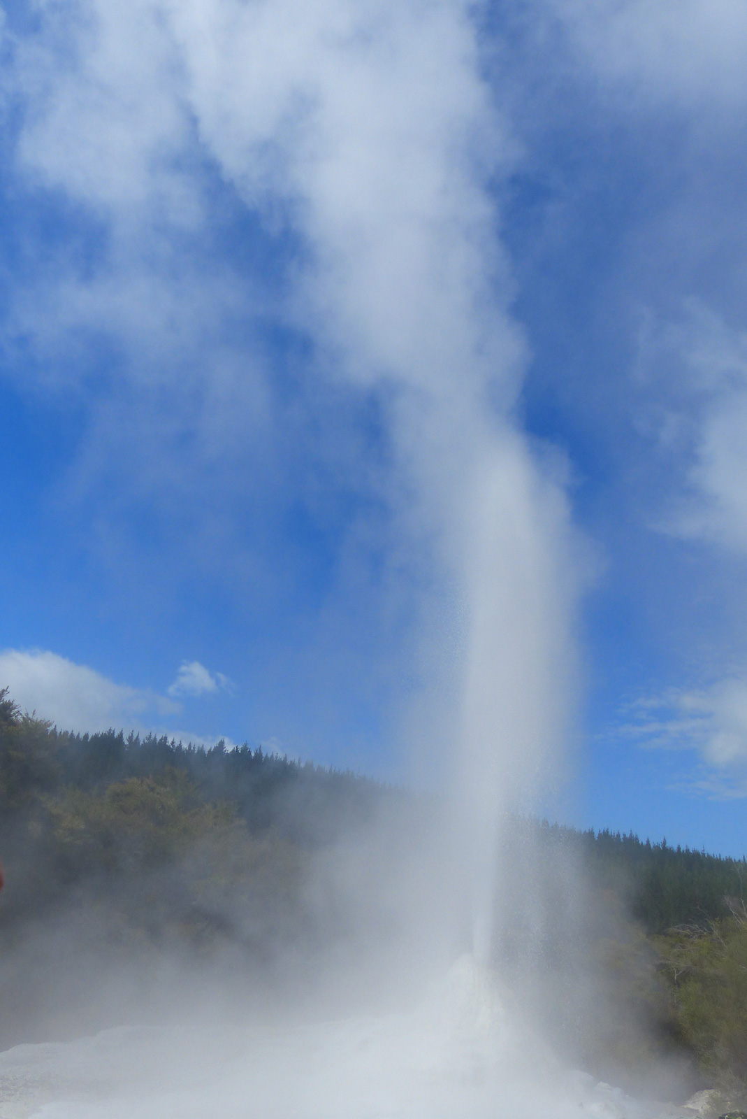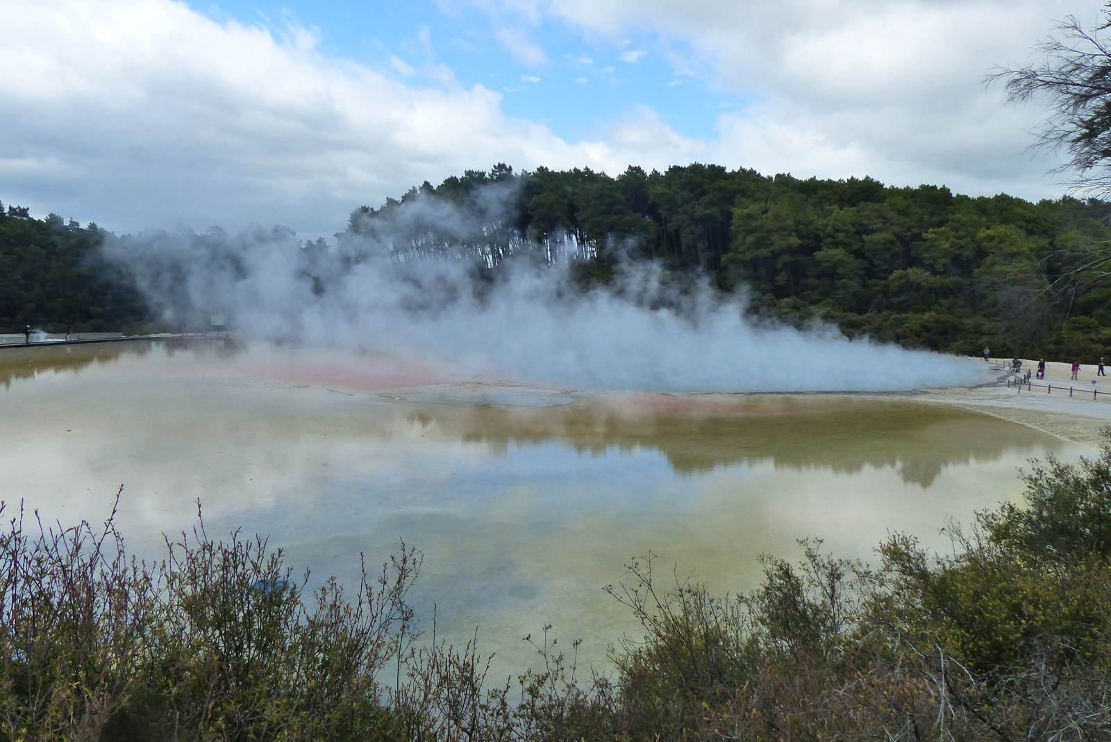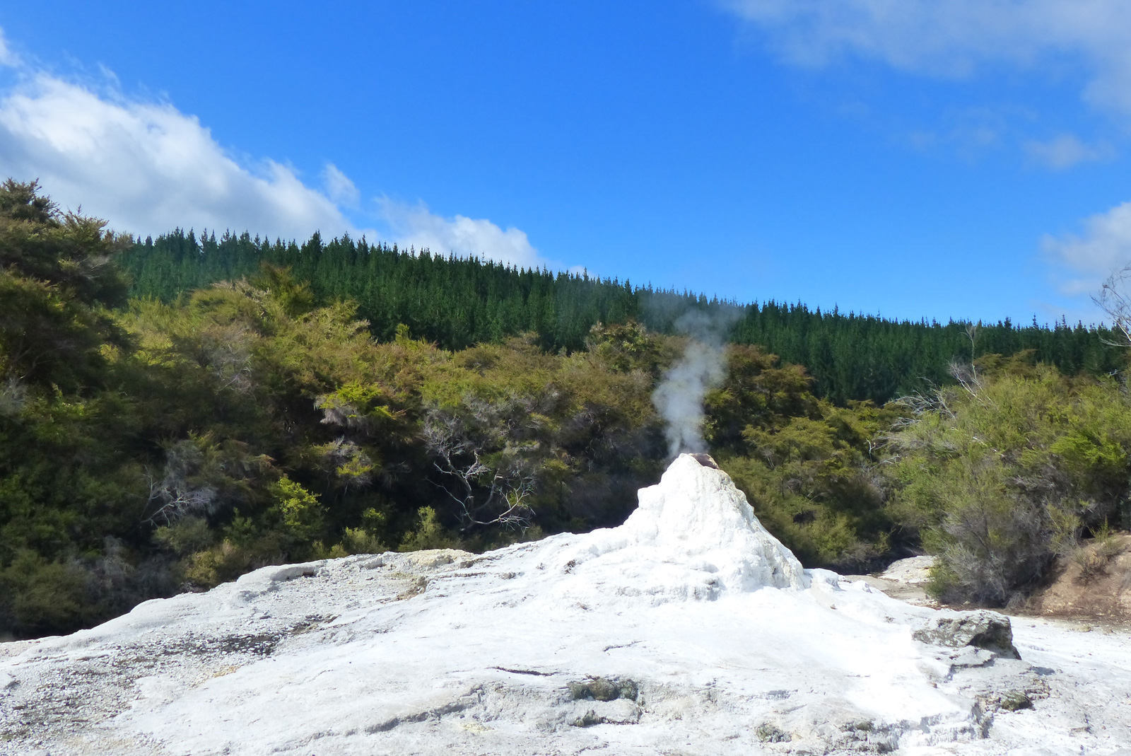 Avant de visiter le parc Wai-o-Tapu, nous nous rendons juste à côté pour aller admirer le geyser lady knox qui crache chaque jour à 10h15. Il est précis, me direz-vous ! En fait ils l’activent chaque jour à la même heure en mettant du savon à l’intérieur…
