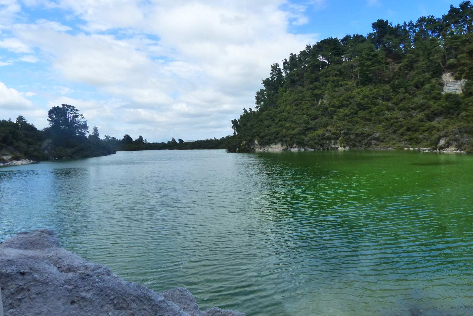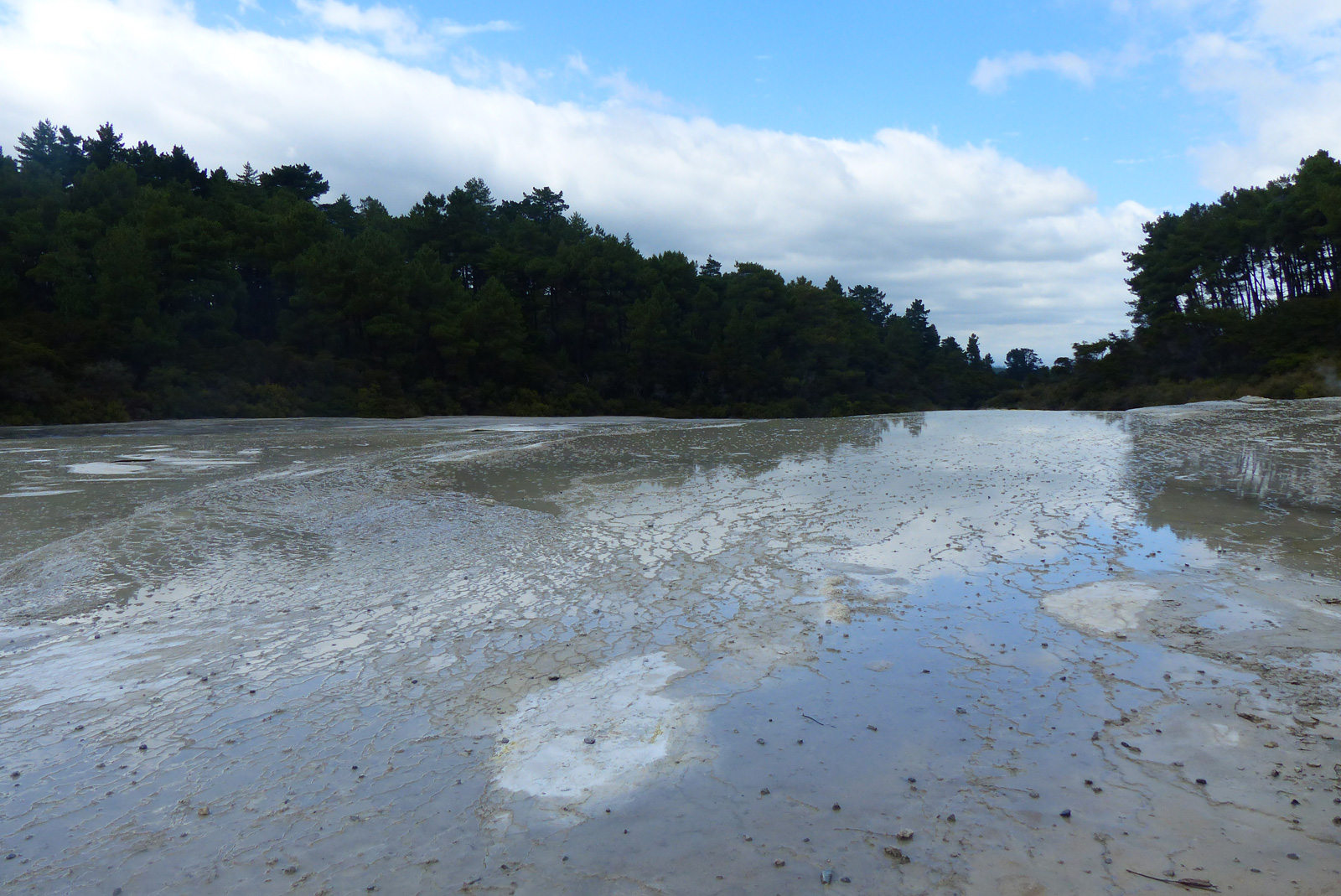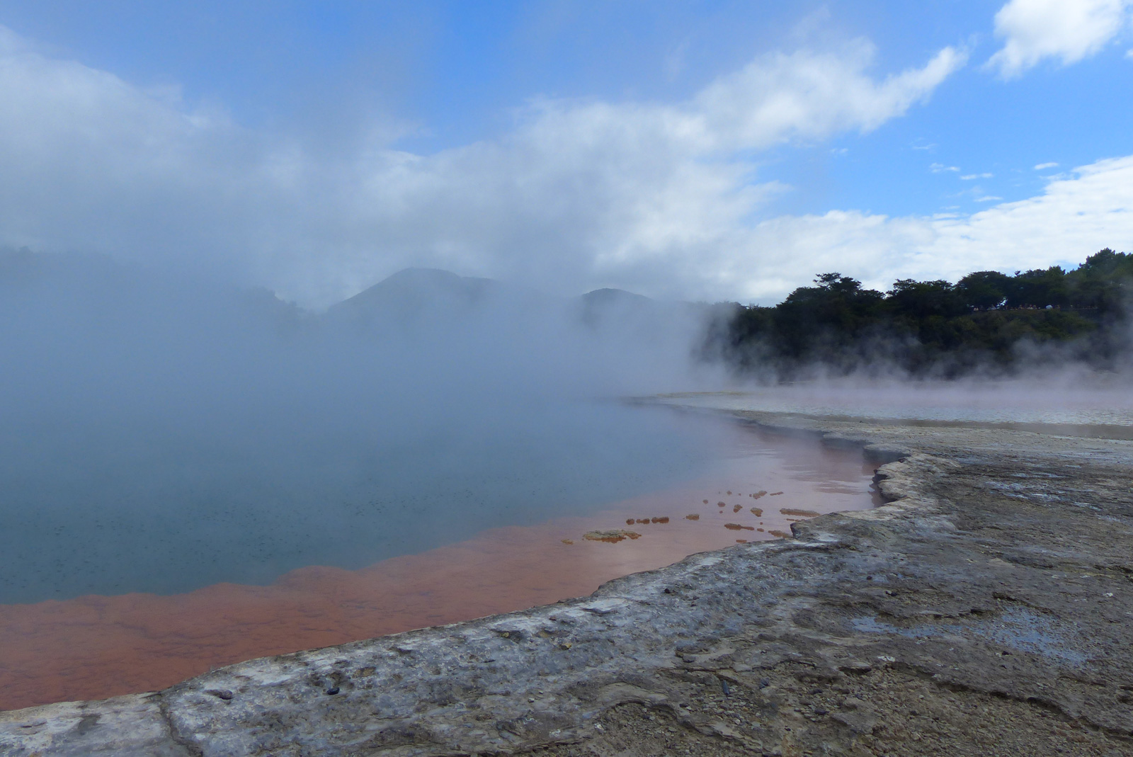 - Une lagune dénommée la « champagne pool » car les abondantes émanations de dioxyde de carbone rappellent les bulles dans un verre de Champagne. L’eau turquoise contraste avec les bords d’un magnifique orange Hermes